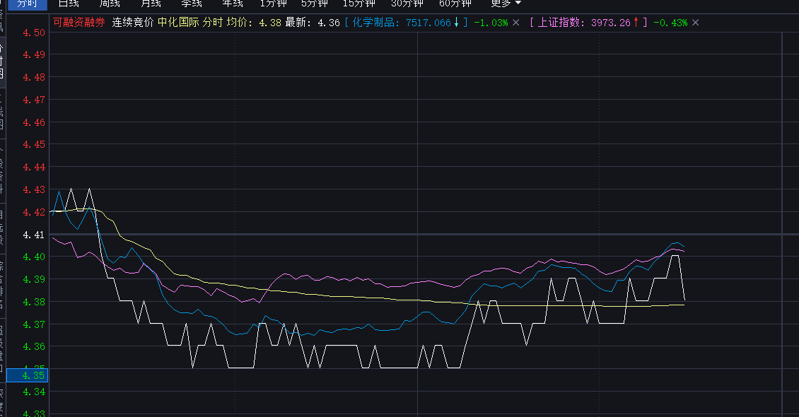 今天就这样了,上去的概率不大,4.38均线上下2分钱左右来回串一下。