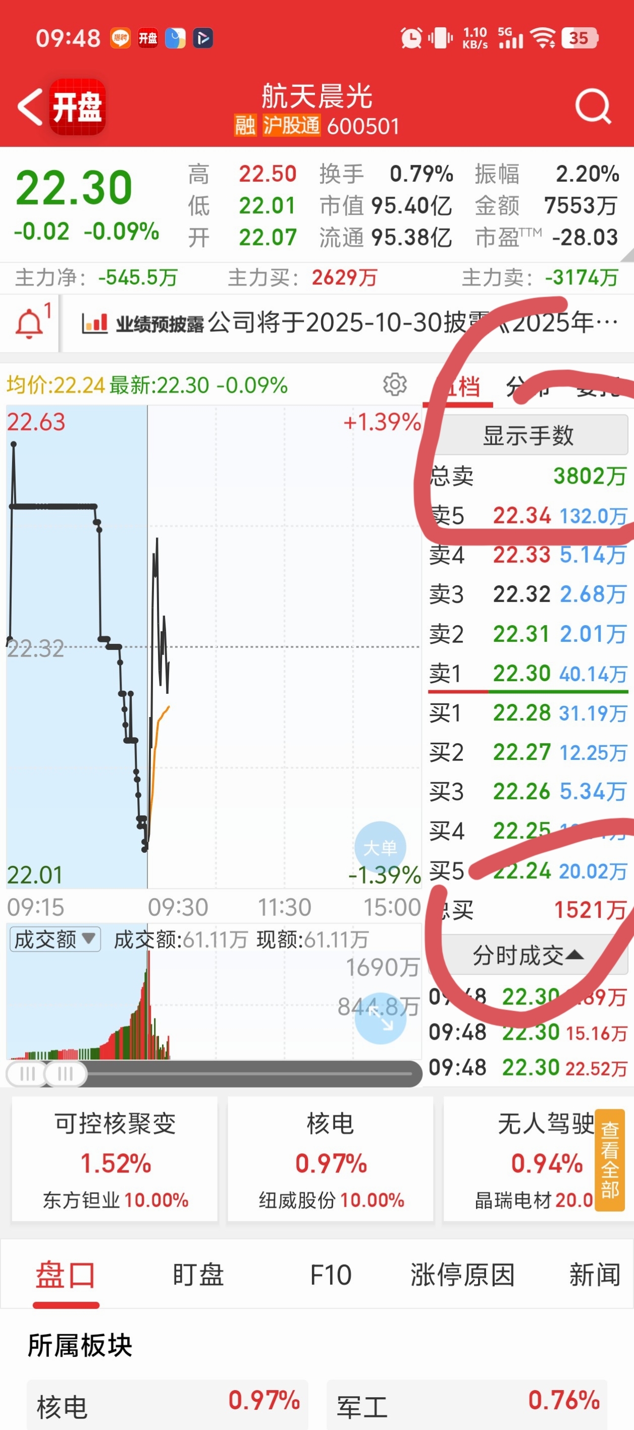 $航天晨光(SH600501)$ 没戏,卖盘太多!主力持续留出!