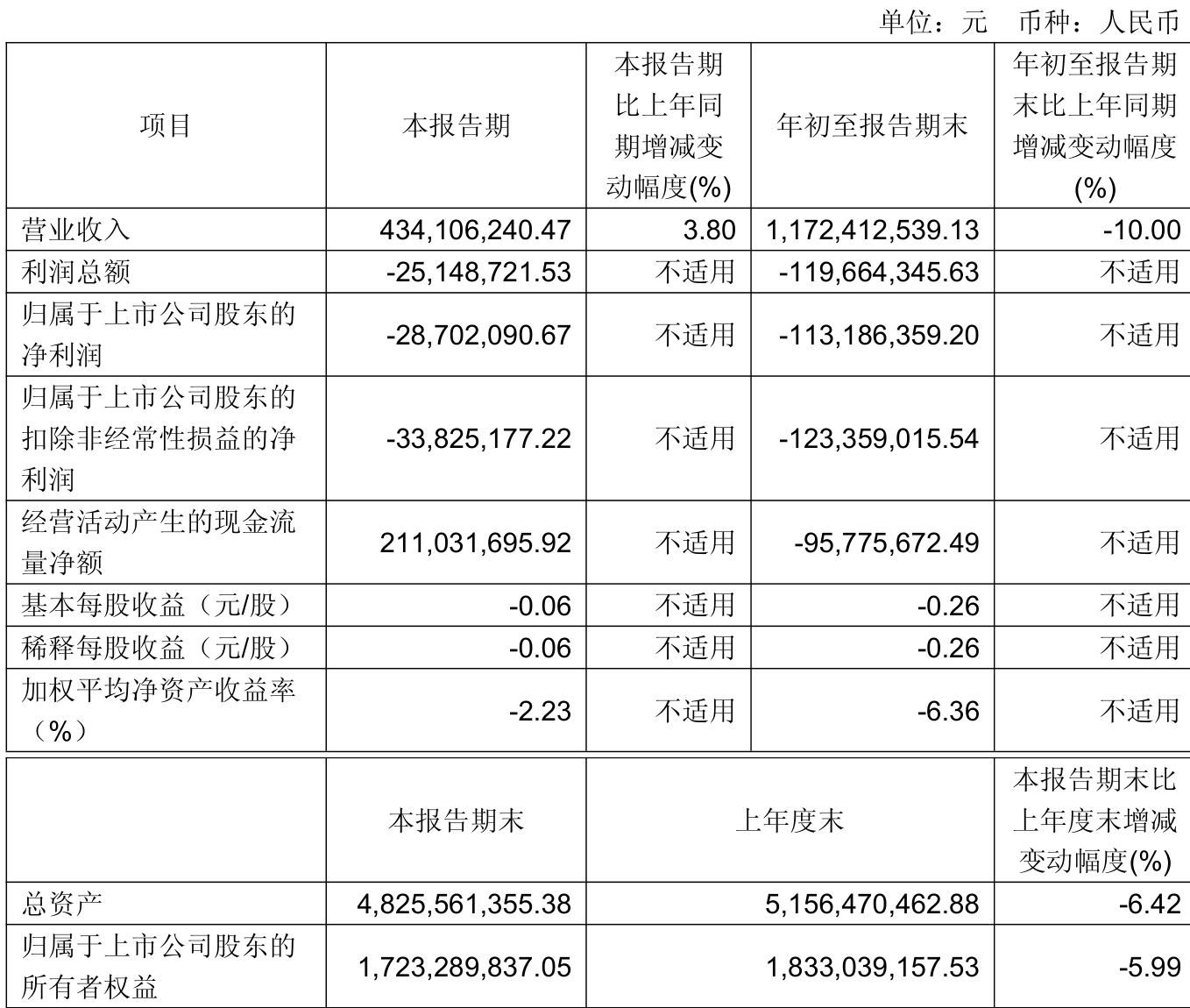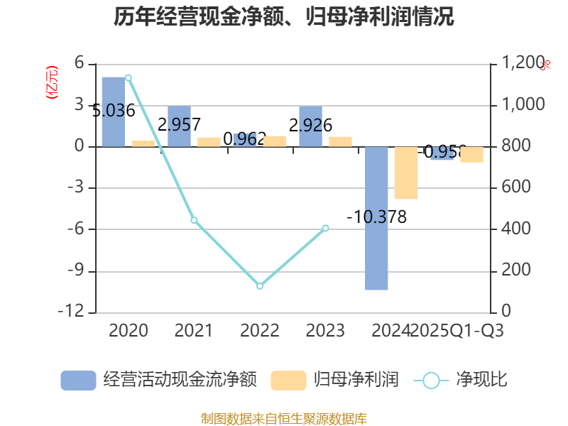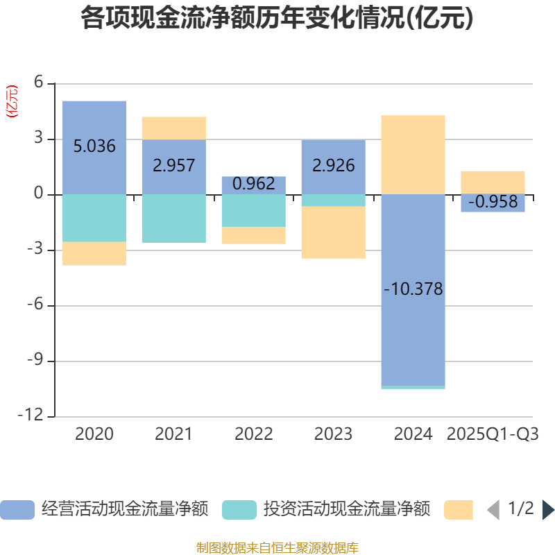 2025年前三季度,公司经营活动现金流净额为-9577.57万元,同比增加9.62亿元;筹资活动现金流净额1.2亿元,同比减少3.39亿元;投资活动现金流净额407.95万元,上年同期为-577.08万元。