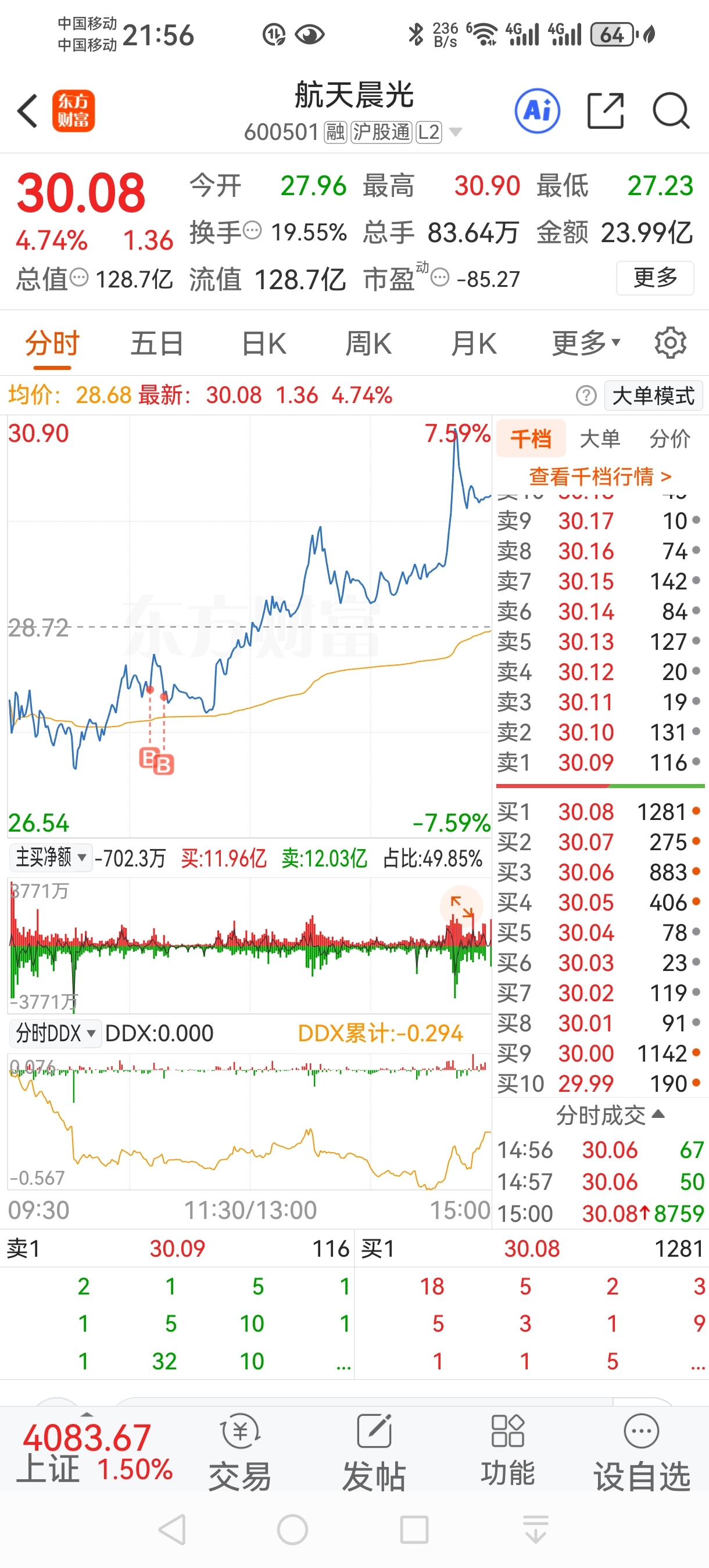 $航天晨光(SH600501)$ 我最近火气比较大,买什么赚什么今天最底和最高正负差不多十个点吧,今天就当涨停板操作了明天高开看稳
