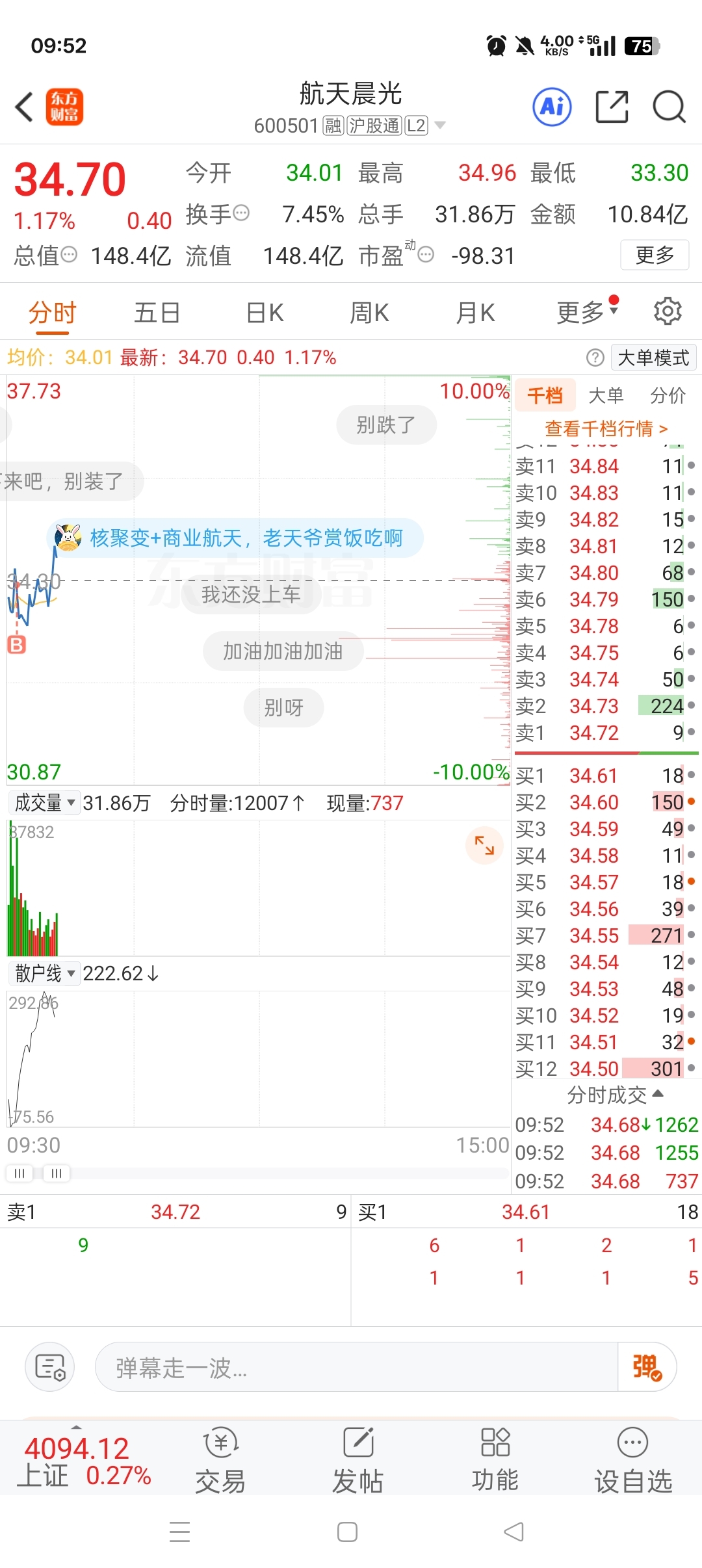 $航天晨光(SH600501)$ 7个点卖飞利欧过来的,你可要争气点,加油加油加油
