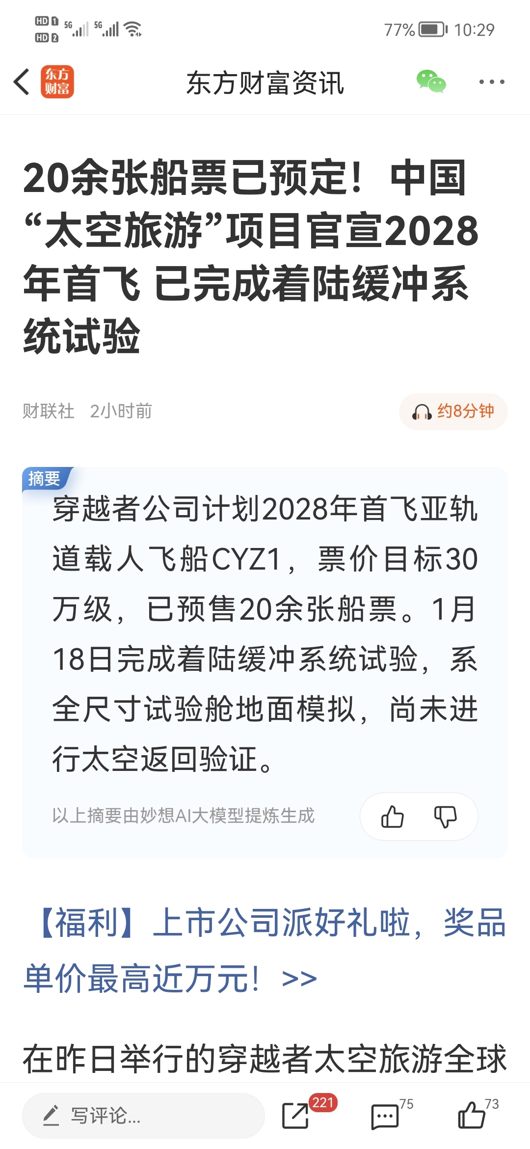 $航天晨光(SH600501)$ 力挺!20余张船票已预定!中国“太空旅游”项目官宣2028年首飞 已完成着陆缓冲系统试验。