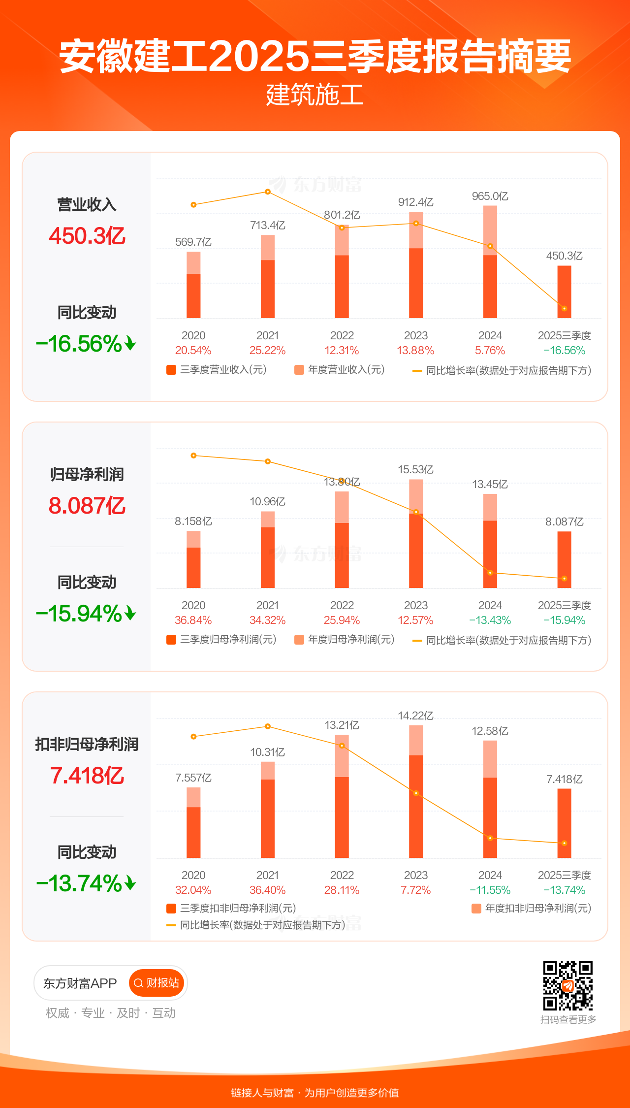 安徽建工10月31日发布2025年三季报显示,公司前三季实现营业收入450.26亿元,同比下滑16.56%;归母净利润8.09亿元,同比下滑15.94%;扣非归母净利润7.42亿元,同比下滑13.74%。