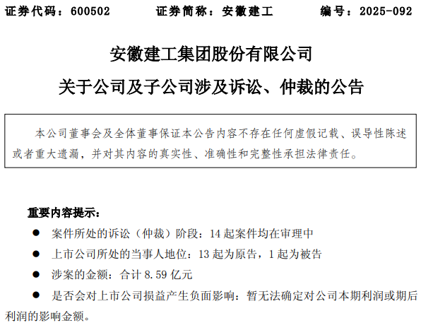 12月17日,安徽建工(600502)公告,公司及子公司近期涉及14起诉讼仲裁案件,涉案金额合计8.59亿元,其中13起为原告,1起为被告。