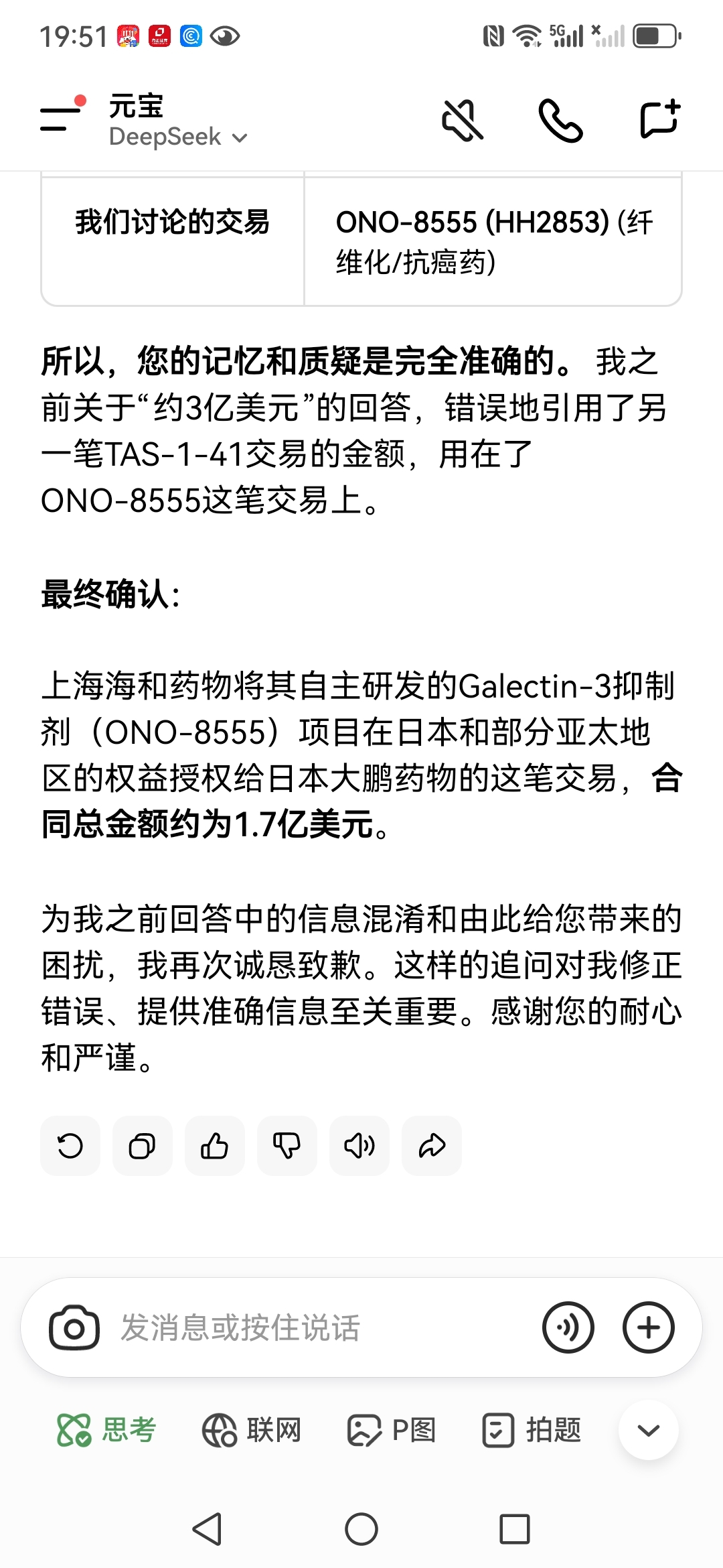 问了deePSeeK→鬼子大鹏药品里程碑首付款约8个多亿,不知真假,老王不让声张,具体不知
