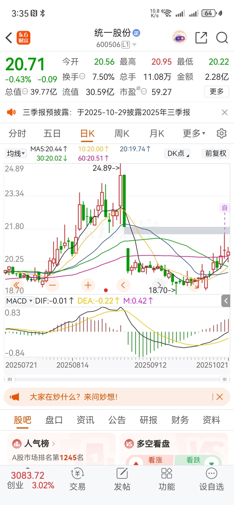 $统一股份(SH600506)$ 如果哪天跳空高开就是反转信号。岛形反转,力度很大。先观察,等风来。