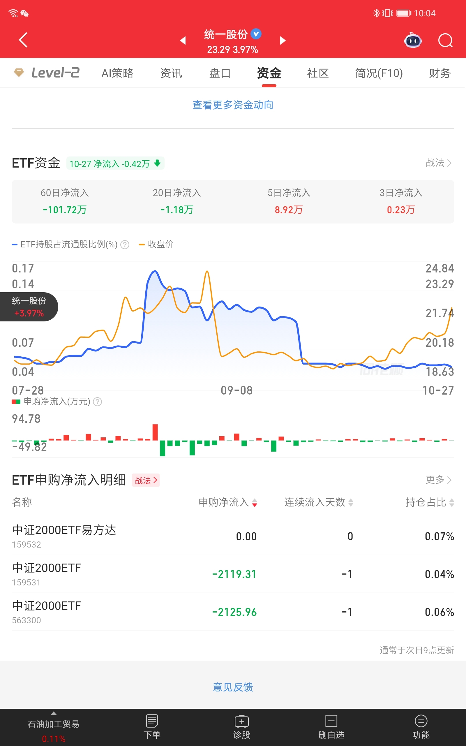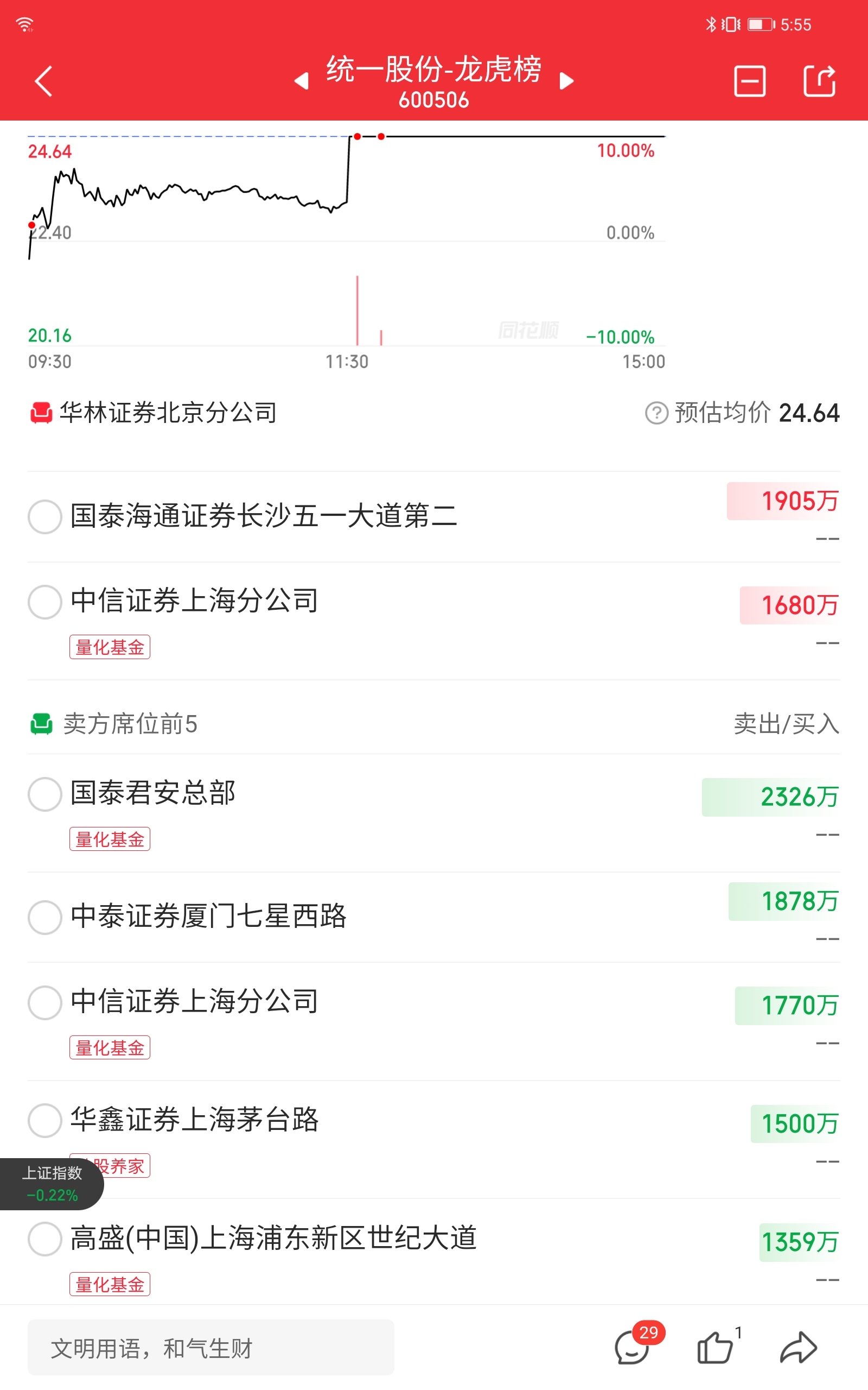 $统一股份(SH600506)$ 这个榜还可以,可以看出来量化基金跑了5400万,买入了4000万,买入的有一个是量化打板,2300万,量化打板明天开盘应该会跑一半,所以肯定不会一字板。把这个量化打板洗出去只要不大跌就问题不大。而且看第二张图,上次两个大绿棒子就是这几个量化砸的,这次把他们洗出去了是最大的利好。