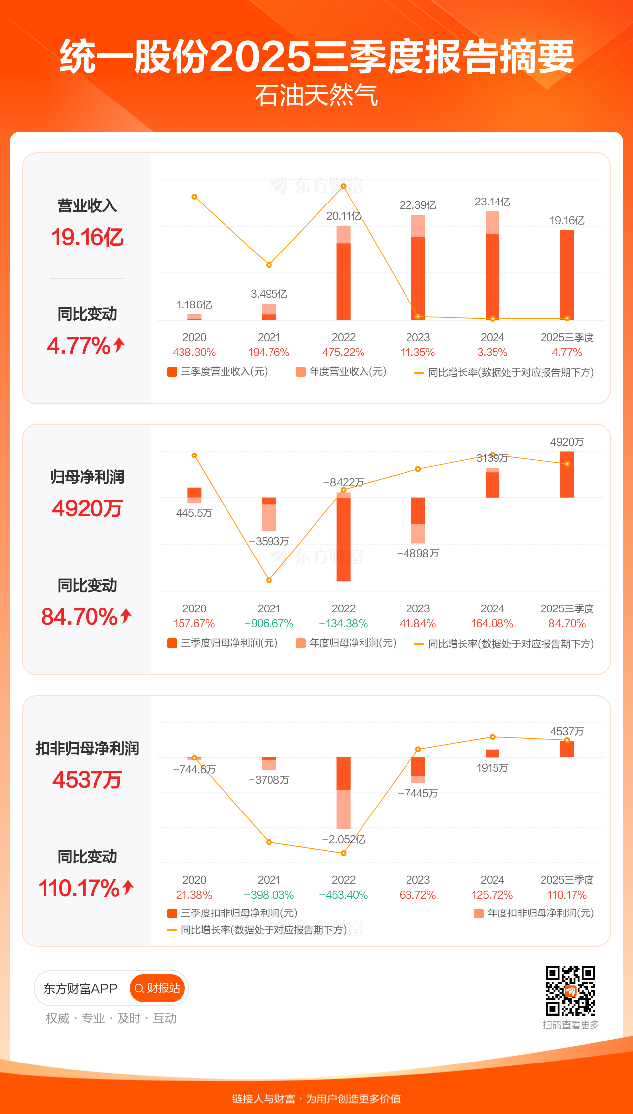 统一股份10月29日发布2025年三季报显示,公司前三季实现营业收入19.16亿元,同比增长4.77%;归母净利润4920.34万元,同比增长84.70%;扣非归母净利润4537.41万元,同比增长110.17%。