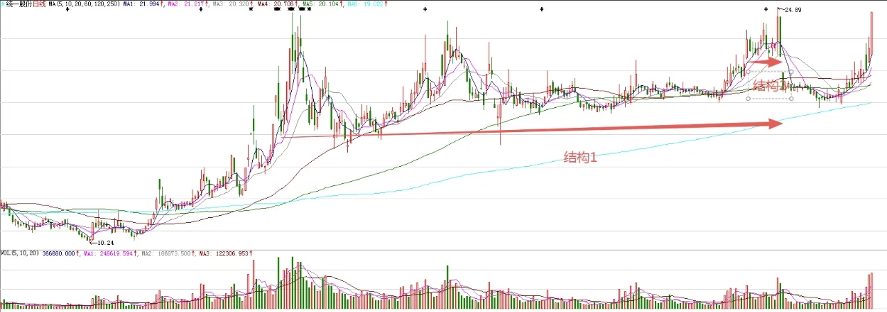 今天低开高走,直奔涨停,强势尽显,符合预期。前阵子的快速下跌,也许只有船长能看懂主力的心思,能够坚持下来。短线来看,今天的大阳线,突破了结构1和结构2的关键位置,打开了上涨的空间。图中标注的大型结构1突破,意味着股价处在比较大的上涨趋势。结构2是结构1突破后的回踩,意味着后期有波段上涨。现在,波段上涨正在进行中,接下来大概率还会继续波段上涨。