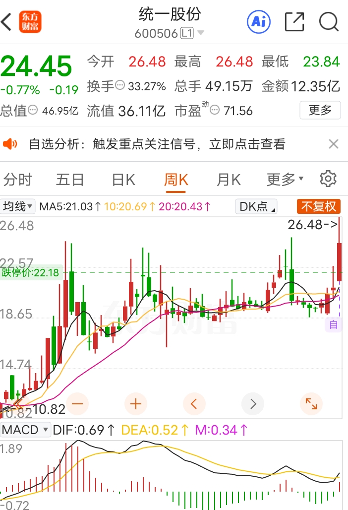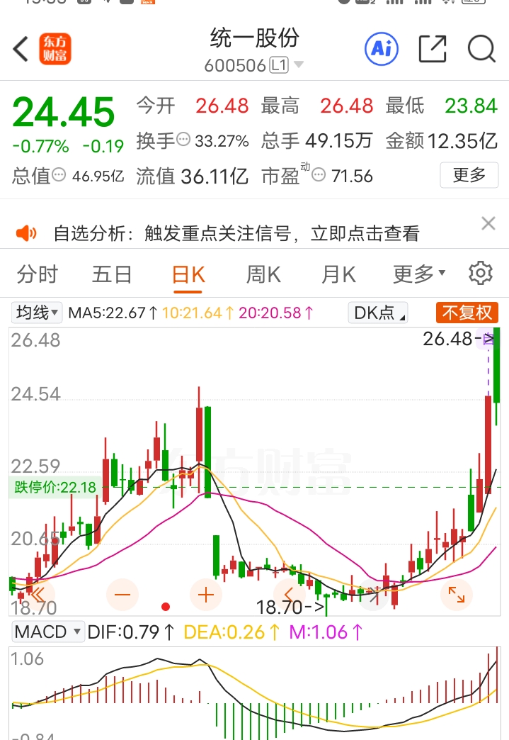 $统一股份(SH600506)$ 只赢不输(第二天)出师未捷身先死啊。买价25.6元,于是看了看下面这两张图。应该没事。技术分析认为,周线快线和慢线在0轴以上金叉,属强势范筹。看日线更强,均线向上,红色柱状线均步加长。今晚不找别股了,还是那6只股票,持有就好,等待上涨出现。