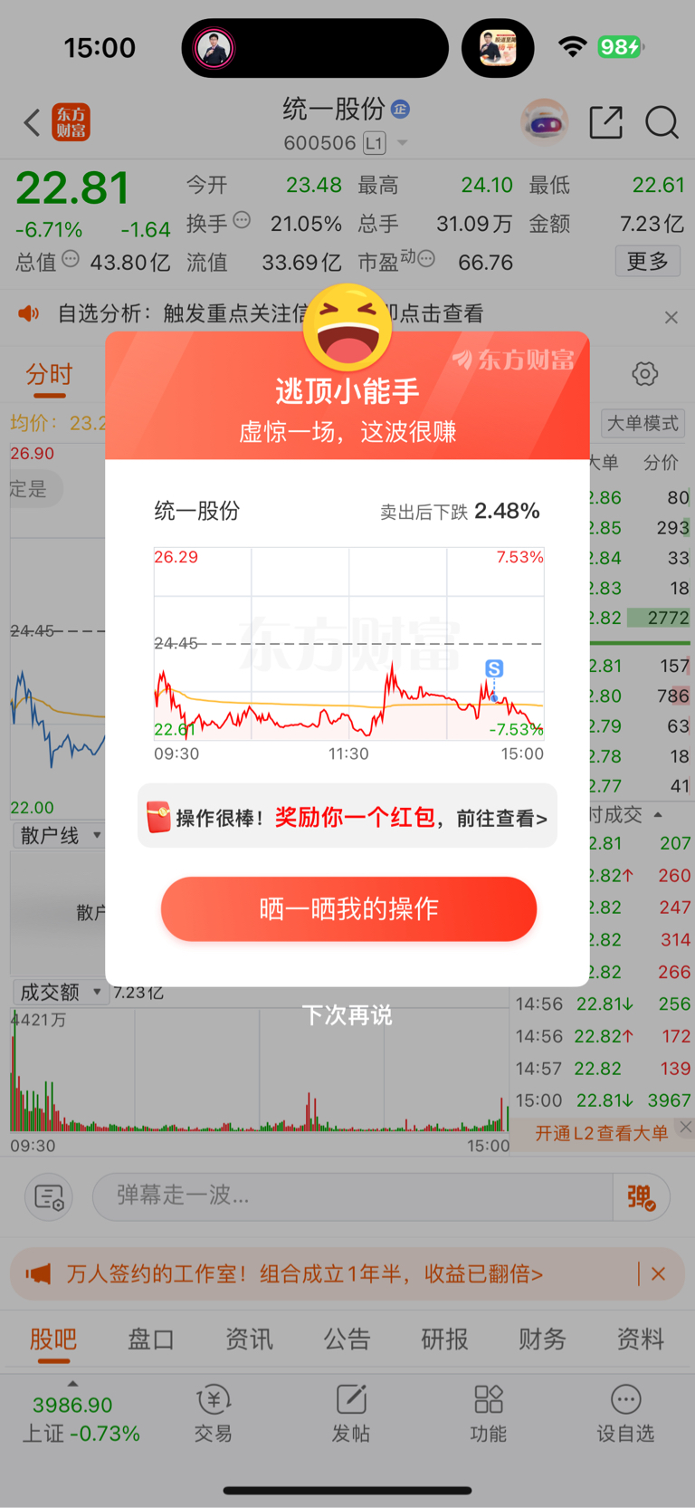 $统一股份(SH600506)$ 果然卖的经典,就知道这股性不行