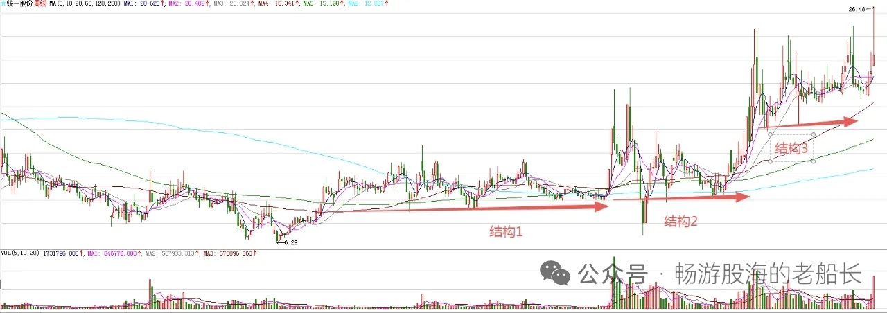 $统一股份(SH600506)$ 周线级别的走势来看,存在三个大型的中枢结构。结构1是根源性结构,意味着股价处在比较大的上涨趋势。结构2规模也比较大,是结构1突破后的回踩,意味着后期有波段上涨。