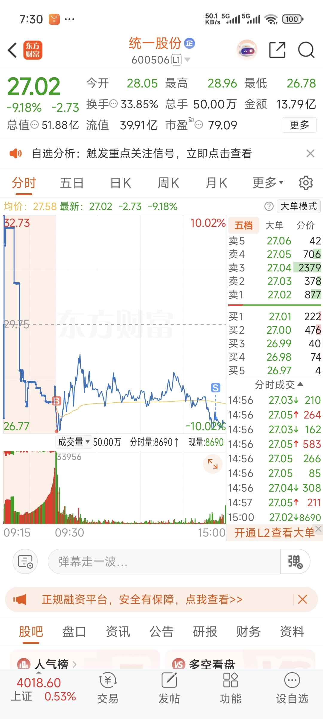 $统一股份(SH600506)$ 开始我觉得有位老兄卖低了,我最后那一波拉升一度认为判断没错,然后就没然后了,先卖出今天继续t