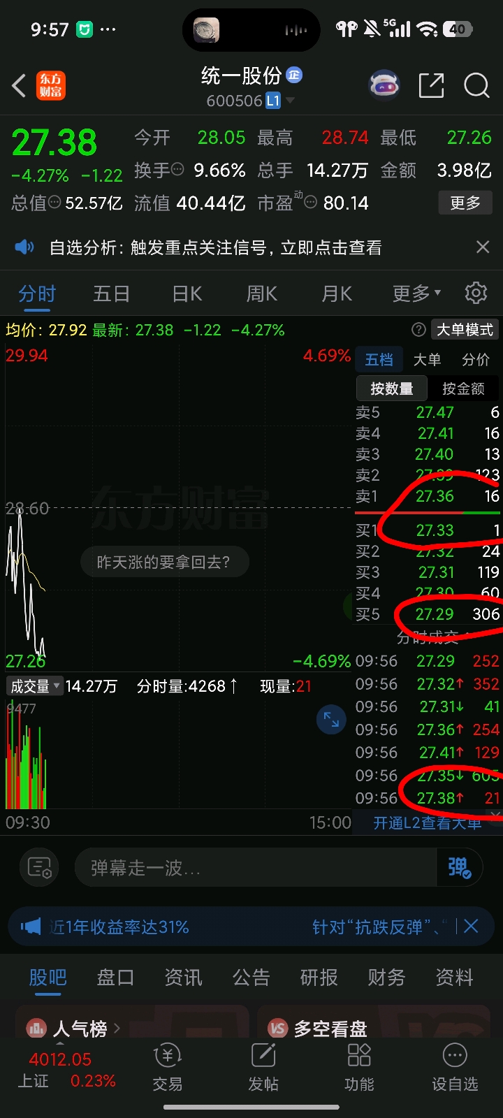 $统一股份(SH600506)$ 看价格,跟最近的买单,明早做空强烈,还有下面还有拖单,,,起不来了,还有低点