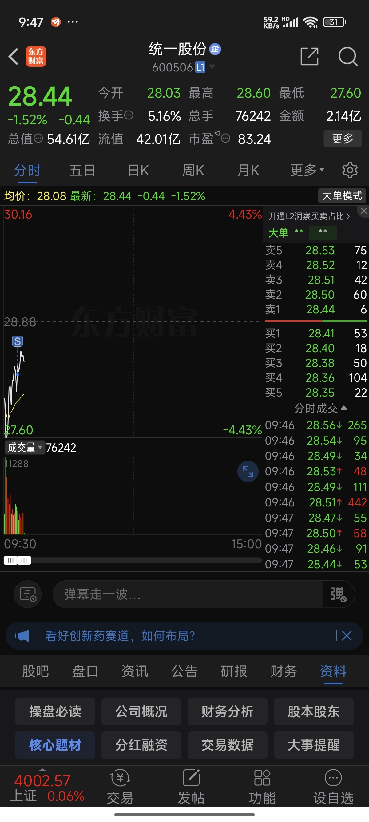 $统一股份(SH600506)$ 感谢主力大哥,今天石油不太好,我先走了,挣了一点,留下的发财