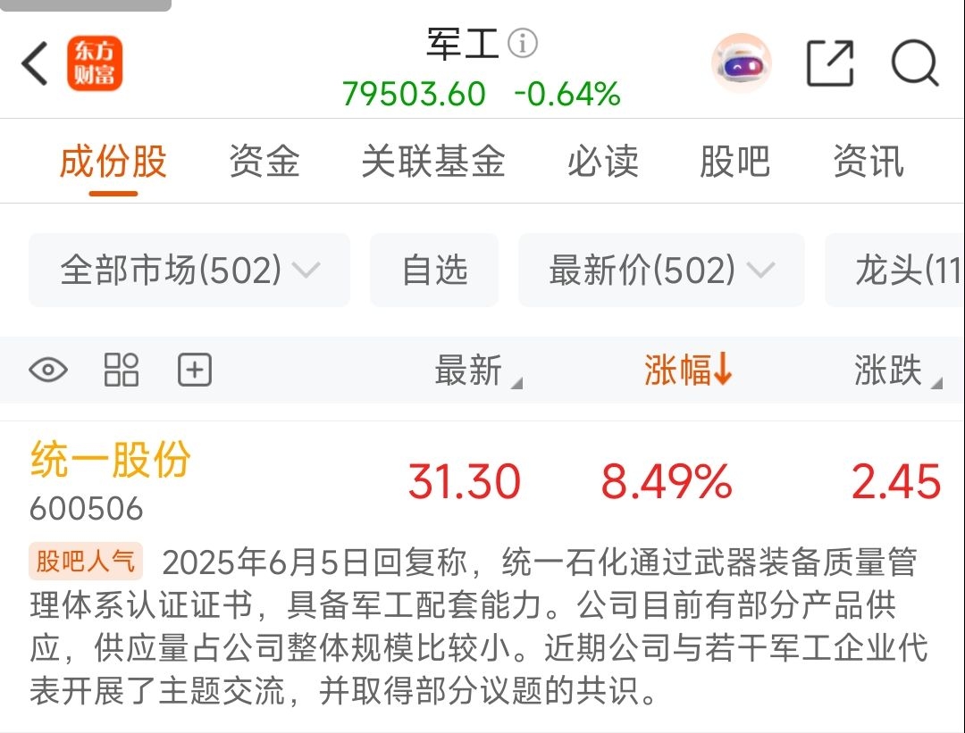 $统一股份(SH600506)$ $合富中国(SH603122)$ 统一股份加分项,军工属性