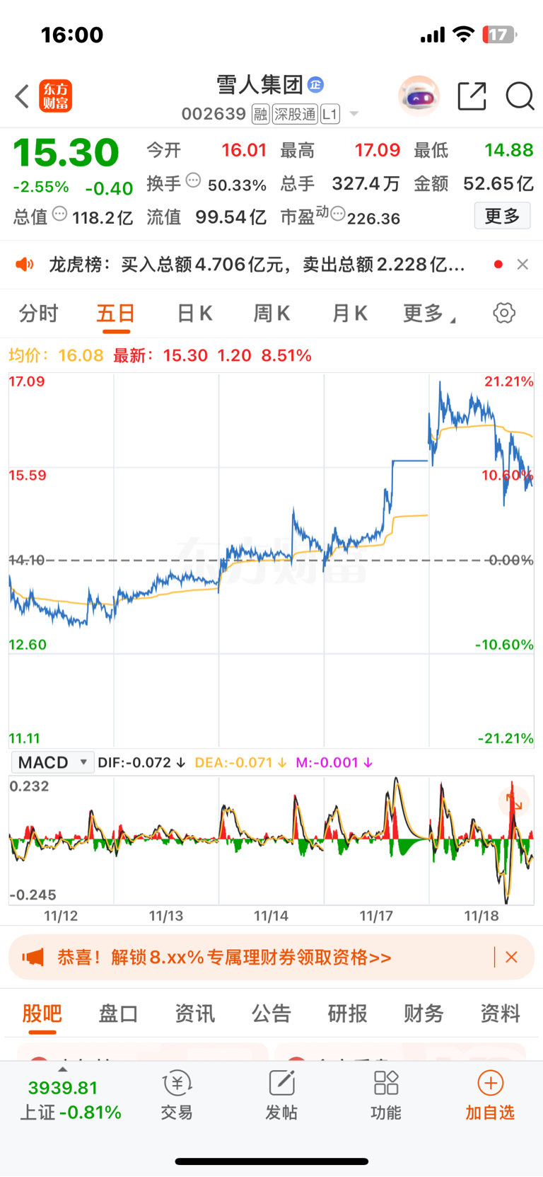 $统一股份(SH600506)$ 给雪人上星期五一样 明天涨停