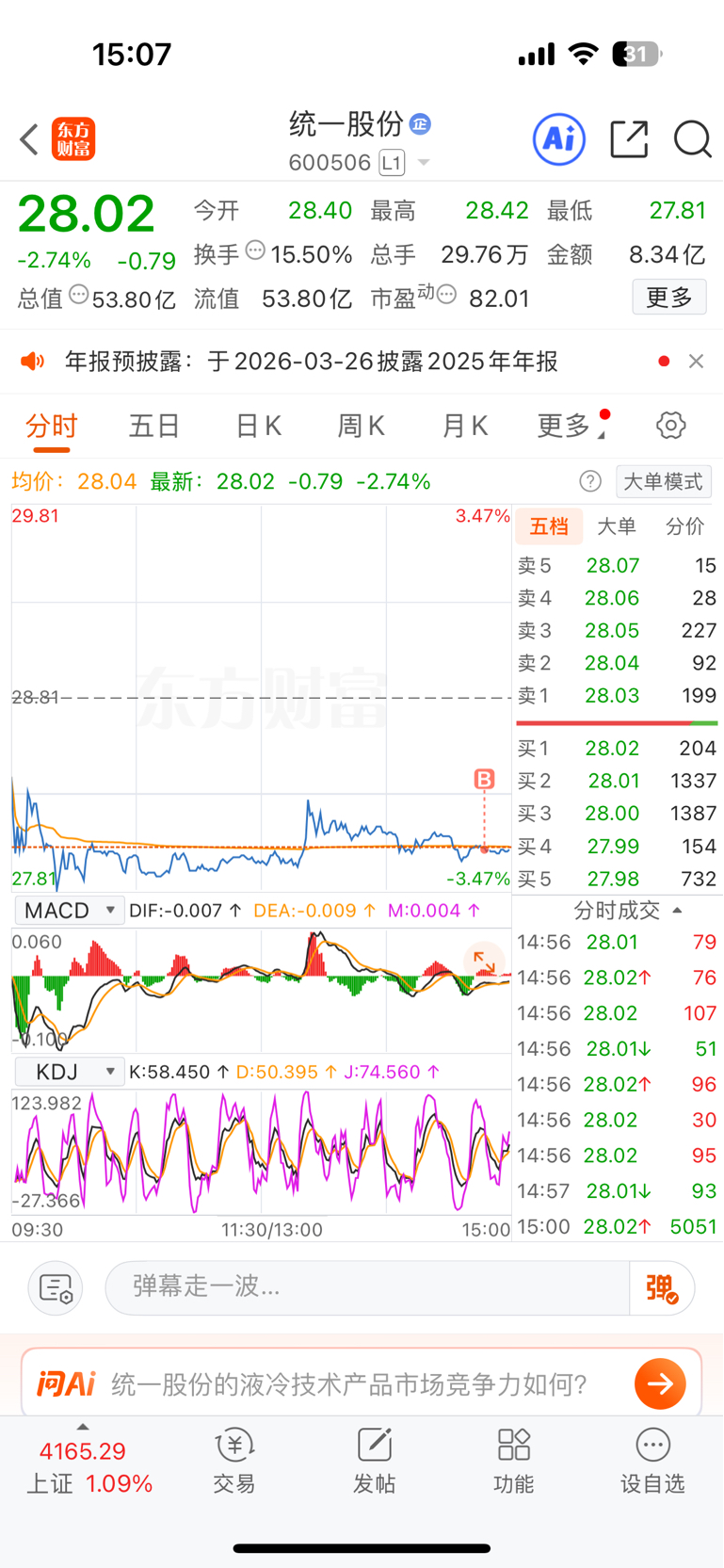 $统一股份(SH600506)$ 卖了蔚蓝锂芯,尾盘进了它,看会不会让人失望,有没有同价位进的股民点个赞
