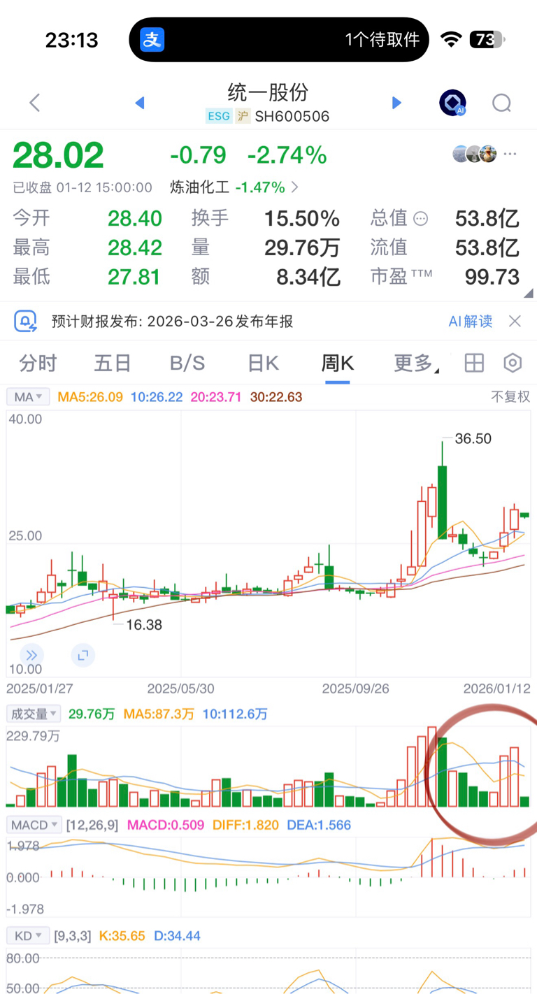$统一股份(SH600506)$ 周线级别三连阳,且持续放量,本周继续看收红K