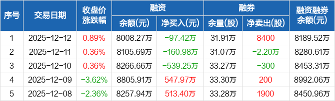融资方面,当日融资买入338.64万元,融资偿还436.06万元,融资净偿还97.42万元,连续3日净偿还累计797.64万元。融券方面,融券卖出8400股,融券偿还0股,融券余量31.91万股,融券余额181.25万元。融资融券余额合计8189.52万元。