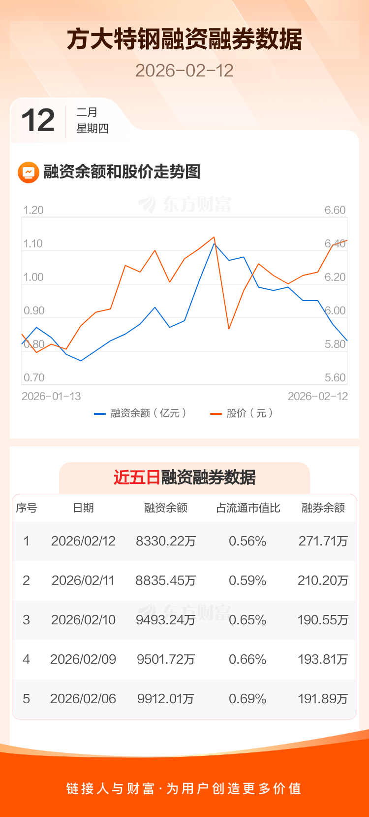 交易所最新数据显示,方大特钢于2026年2月12日获融资买入658.60万元,融资偿还1163.82万元,当日融资净偿还505.22万元。目前,该股融资余额8330.22万,占流通市值比例为0.56%。