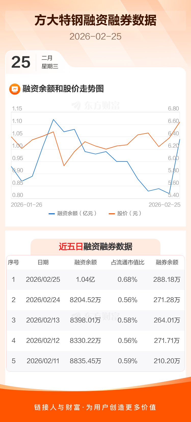 交易所最新数据显示,方大特钢于2026年2月25日获融资买入3782.95万元,融资偿还1579.45万元,当日融资净买入2203.5万元。目前,该股融资余额1.04亿,占流通市值比例为0.68%。