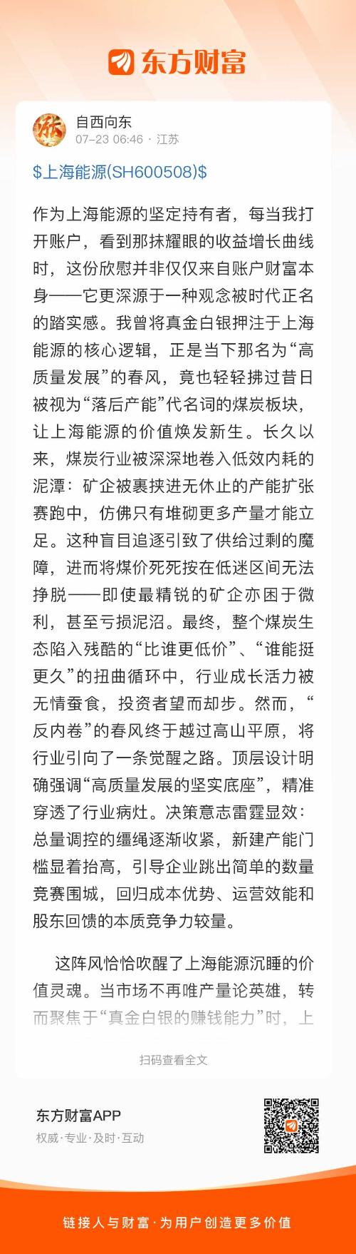 作为上海能源的坚定持有者,每当我打开账户,看到那抹耀眼的收益增长曲线时,这份欣慰并非仅仅来自账户财富本身——它更深源于一种观念被时代正名的踏实感。我曾将真金白银押注于上海能源的核心逻辑,正是当下那名为“高质量发展”的春风,竟也轻轻拂过昔日被视为“落后产能”代名词的煤炭板块,让上海能源的价值焕发新生。长久以来,煤炭行业被深深地卷入低效内耗的泥潭:矿企被裹挟进无休止的产能扩张赛跑中,仿佛只有堆砌更多产量才能立足。这种盲目追逐引致了供给过剩的魔障,进而将煤价死死按在低迷区间无法挣脱——即使最精锐的矿企亦困于微利,甚至亏损泥沼。最终,整个煤炭生态陷入残酷的“比谁更低价”、“谁能挺更久”的扭曲循环中,行业成长活力被无情蚕食,投资者望而却步。然而,“反内卷”的春风终于越过高山平原,将行业引向了一条觉醒之路。顶层设计明确强调“高质量发展的坚实底座”,精准穿透了行业病灶。决策意志雷霆显效:总量调控的缰绳逐渐收紧,新建产能门槛显着抬高,引导企业跳出简单的数量竞赛围城,回归成本优势、运营效能和股东回馈的本质竞争力较量。