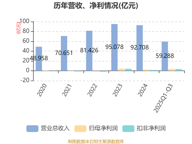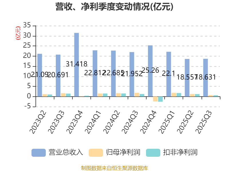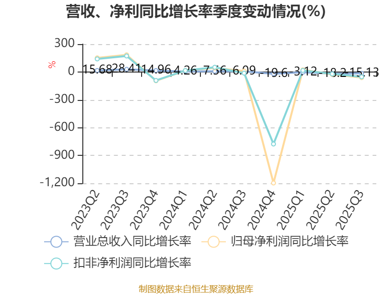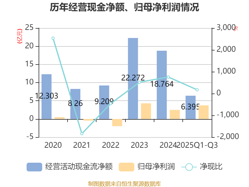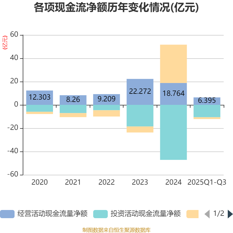 2025年前三季度,公司经营活动现金流净额为6.4亿元,同比下降12.5%;筹资活动现金流净额-1.53亿元,同比减少21.53亿元;投资活动现金流净额-10.63亿元,上年同期为-30.23亿元。