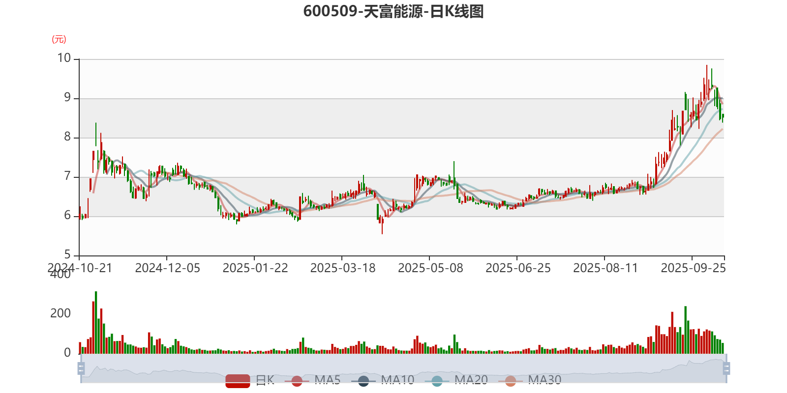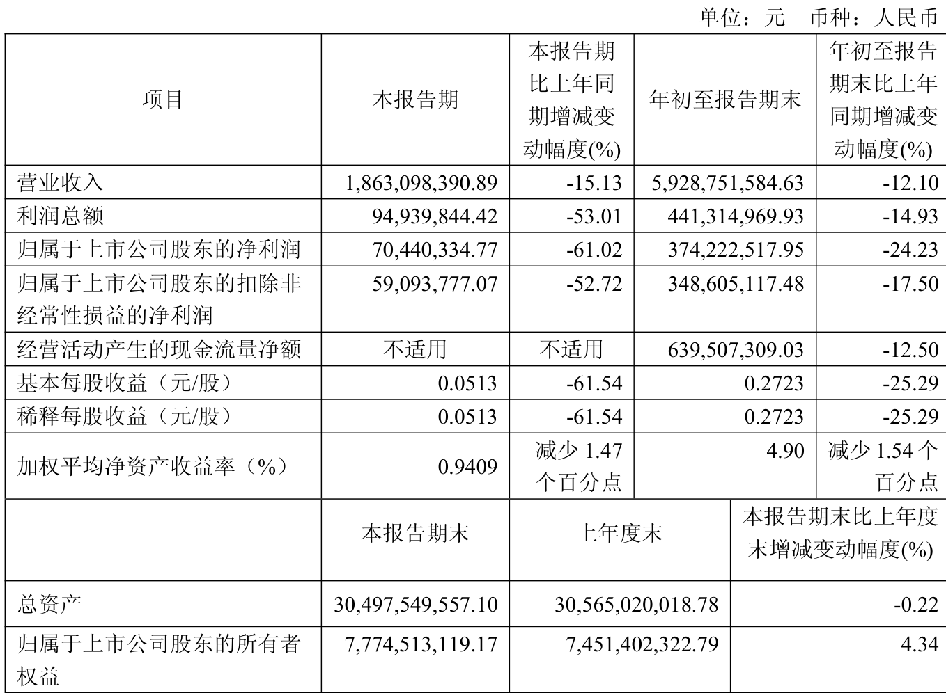 中证智能财讯天富能源(600509)10月21日披露2025年第三季度报告。前三季度公司实现营业总收入59.29亿元,同比下降12.10%;归母净利润3.74亿元,同比下降24.23%;扣非净利润3.49亿元,同比下降17.50%;经营活动产生的现金流量净额为6.4亿元,同比下降12.50%;报告期内,天富能源基本每股收益为0.2723元,加权平均净资产收益率为4.90%。