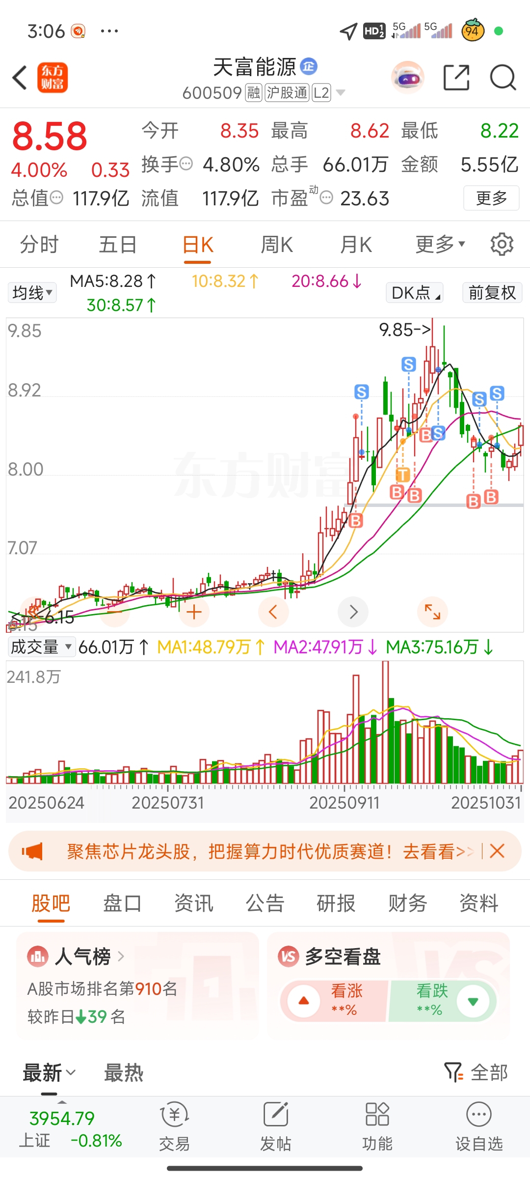 $天富能源(SH600509)$ 不会要停牌了吧?大哥,我还没上车呀!早上仓位全部给了平潭发展,没资金了呀!