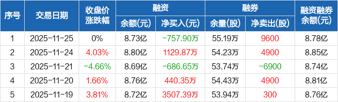 融资方面,当日融资买入5335.01万元,融资偿还6092.91万元,融资净偿还757.9万元。融券方面,融券卖出1.16万股,融券偿还2000股,融券余量55.19万股,融券余额469.67万元。融资融券余额合计8.78亿元。