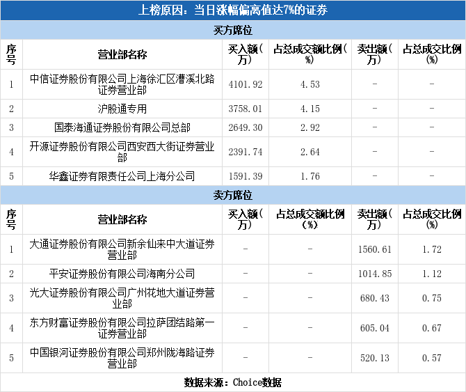 沪股通现身龙虎榜,天富能源涨停(12-04)
