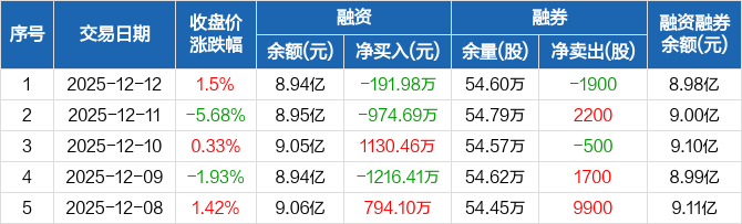 天富能源:融资净偿还191.98万元,融资余额8.94亿元(12-12)