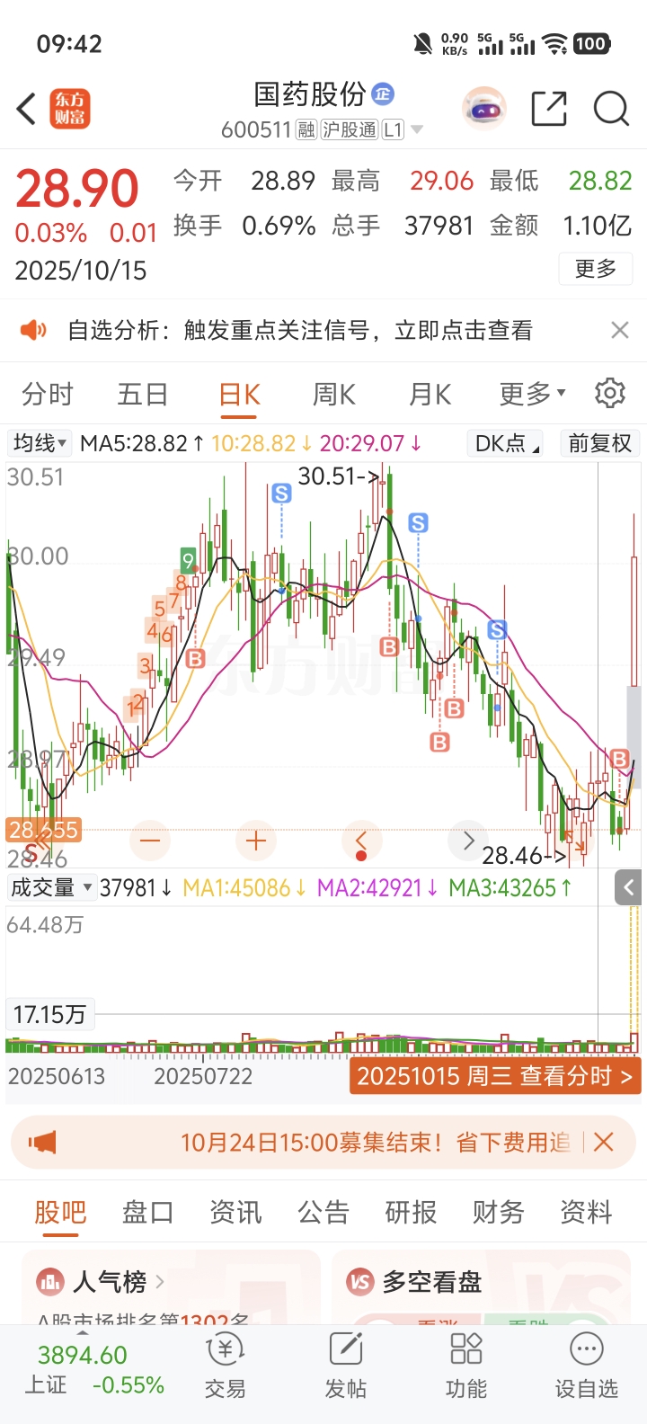 $国药股份(SH600511)$ 起飞了哈哈,28.65的本,不到四十不会卖的哈哈