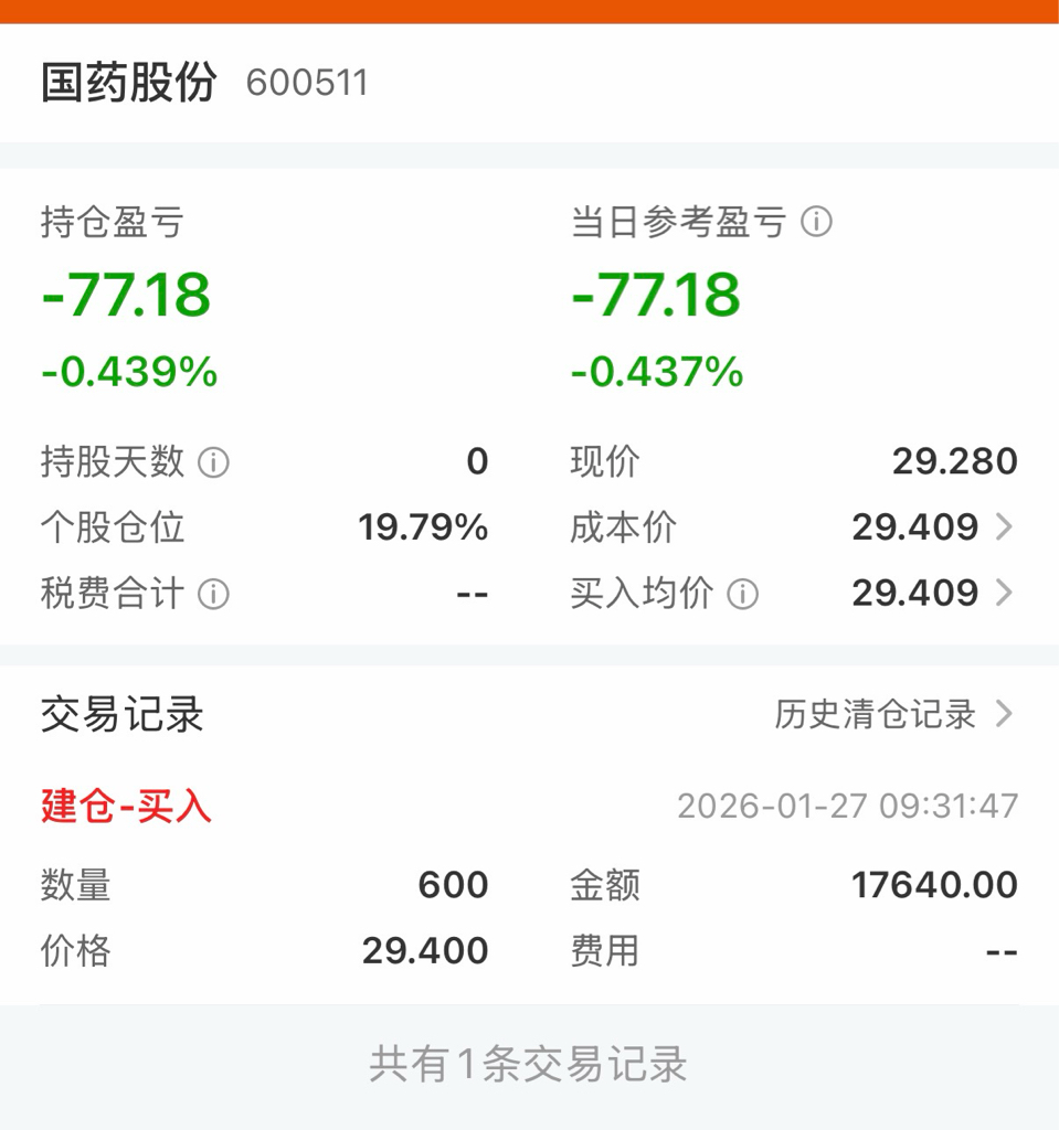 $国药股份(SH600511)$ 昨晚研究了一晚,怕今天高开买不了,看见29.4狂按买入,直接套上
