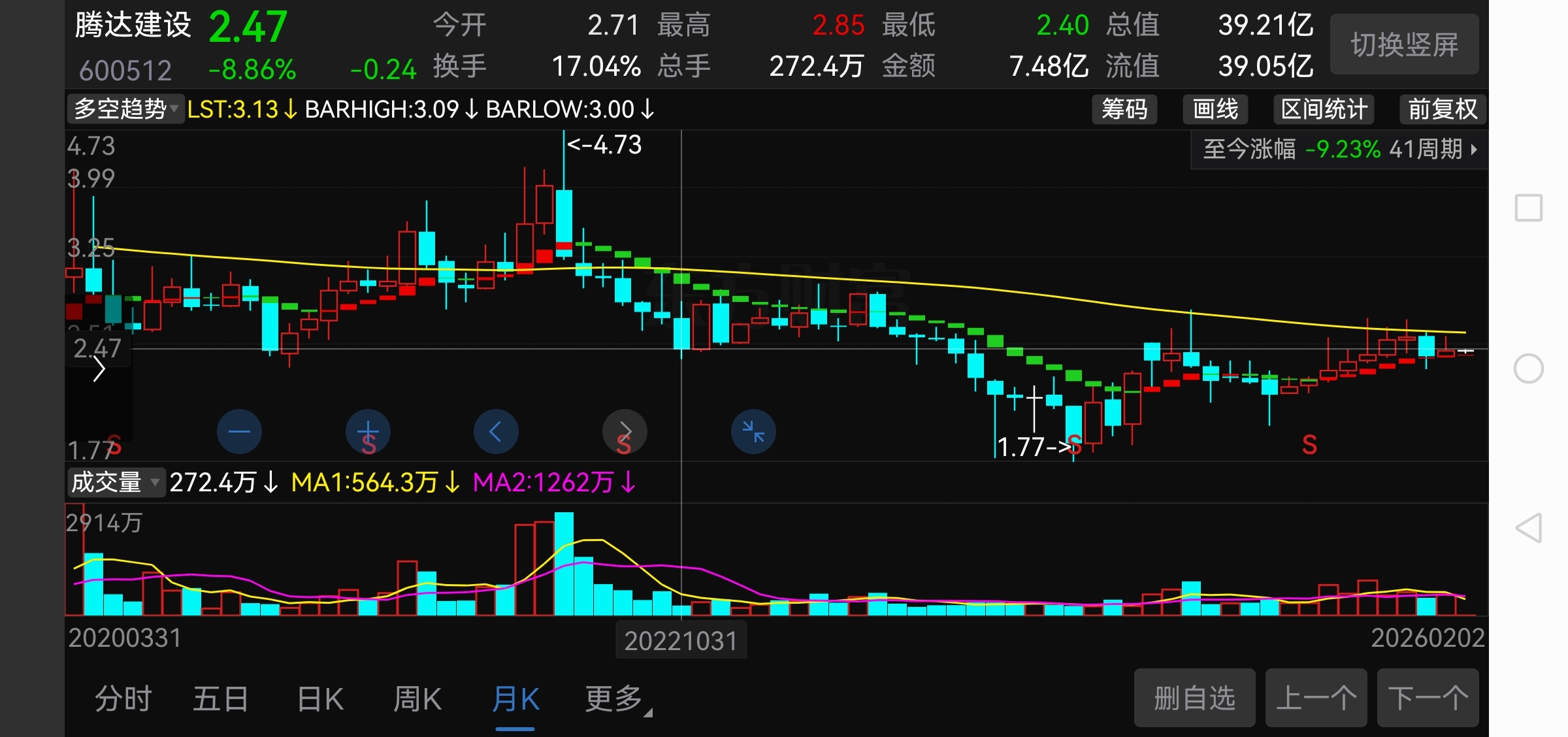 $腾达建设(SH600512)$ 顶线,2.78,冲线,2.71,高点过压力收盘在压力线下,穿线,实体穿越压力,坐线,回踩,拉!过年前没戏,年后在看了,有?没有?