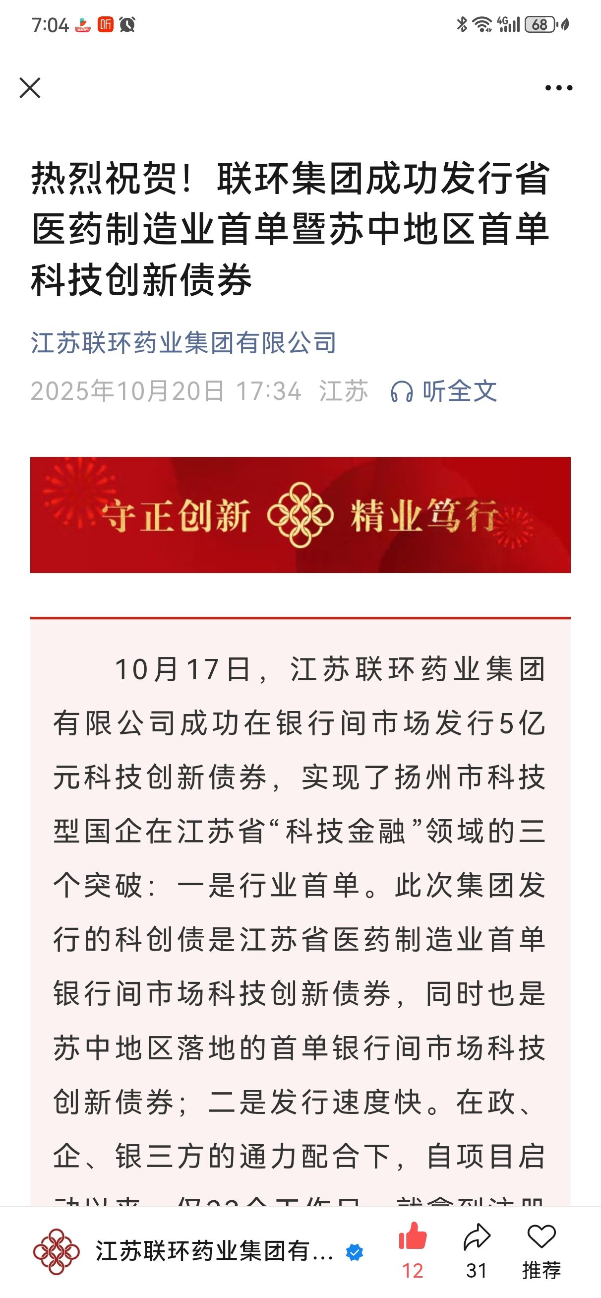 江苏联环药业股份有限公司(以下简称“公司”、“联环药业”)于 2025年 7 月 24 日召开第九届董事会第十二次临时会议,审议通过了《关于公司拟发行科技创新债券的议案》,为积极响应国家科技创新政策导向,加大科技创新投入力度,同时进一步拓宽融资渠道、降低融资成本并优化债务结构,公司董事会同意公司拟向中国银行间市场交易商协会申请注册发行最高不超过人民币 5 亿元(含 5 亿元)科技创新债券。具体情况如下: