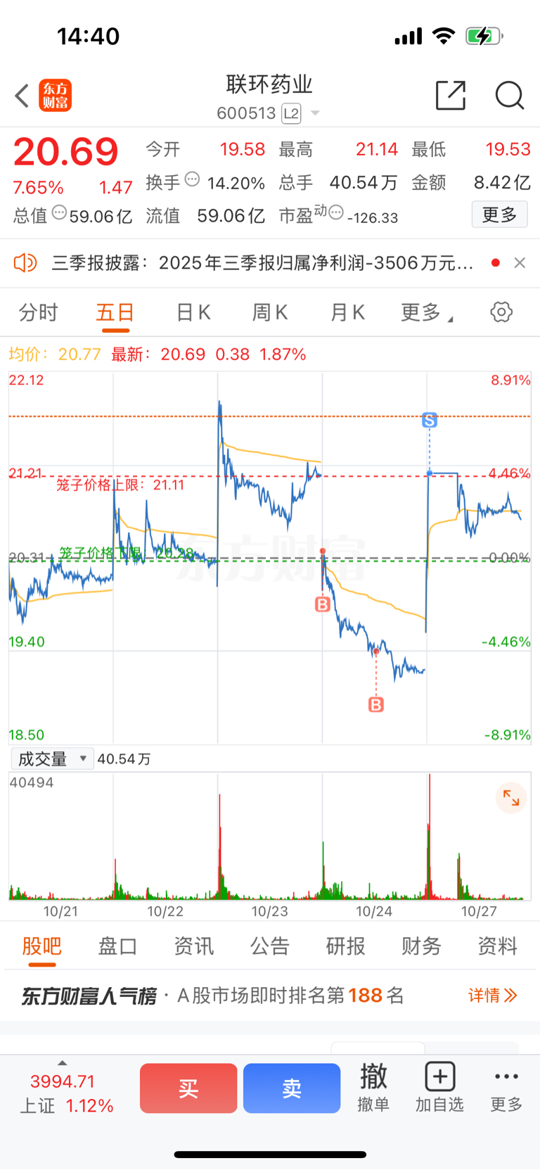 $联环药业(SH600513)$ 24买的,一路做T一路补,现在还没够本,上可攻下可守,我就不信回不了本!主升浪是不是要快了,这几天异动可不小,明天低开进,高开…是不可能的
