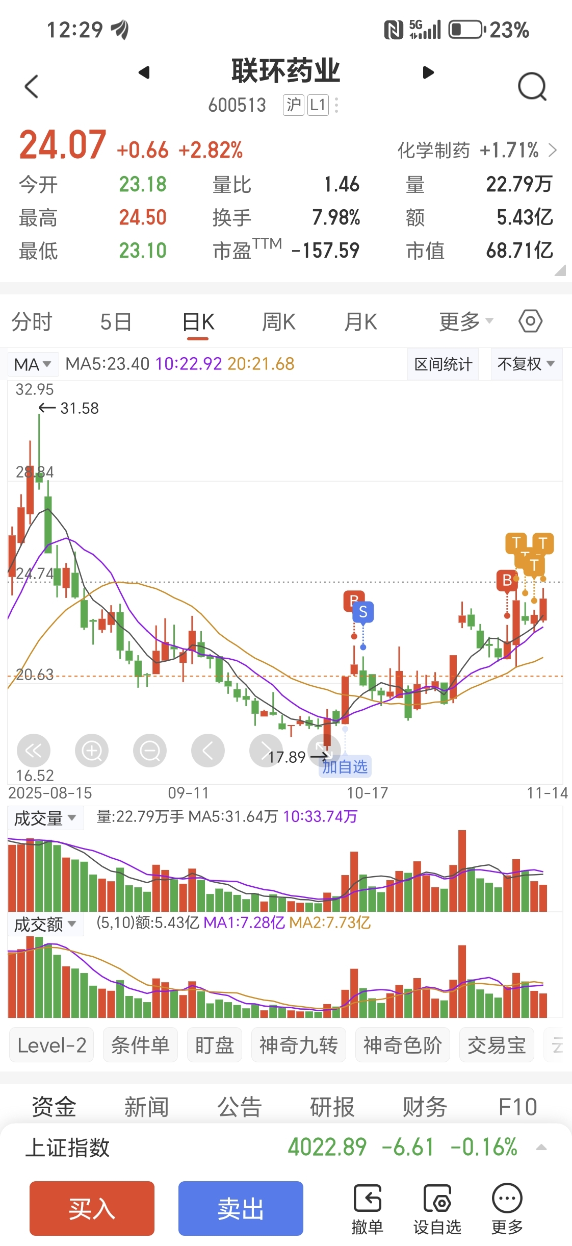 $今日成交股票:操作原因:每天T一次,不亦乐乎!联环药业(SH600513)$
