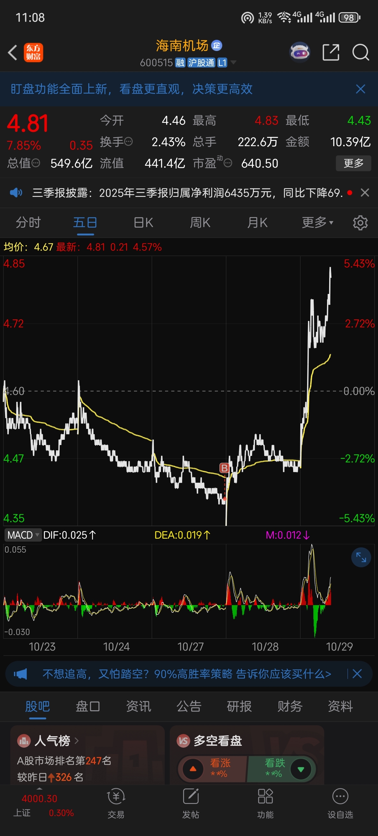 $海南机场(SH600515)$ 这算是抄底成功了吧