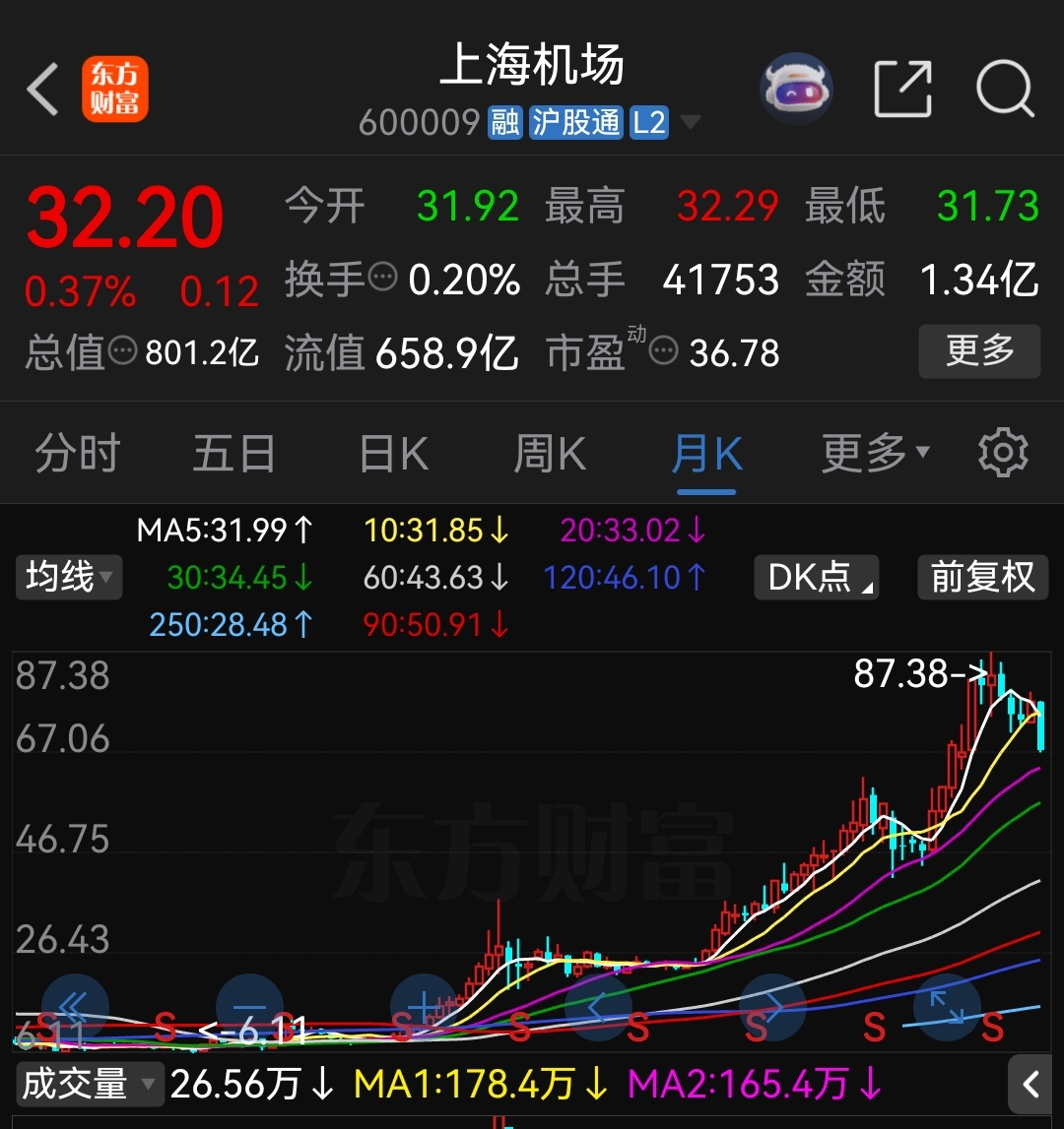 $海南机场(SH600515)$ 海南机场,封关后走势对飙的是上海机场,看看上海机场走势吧