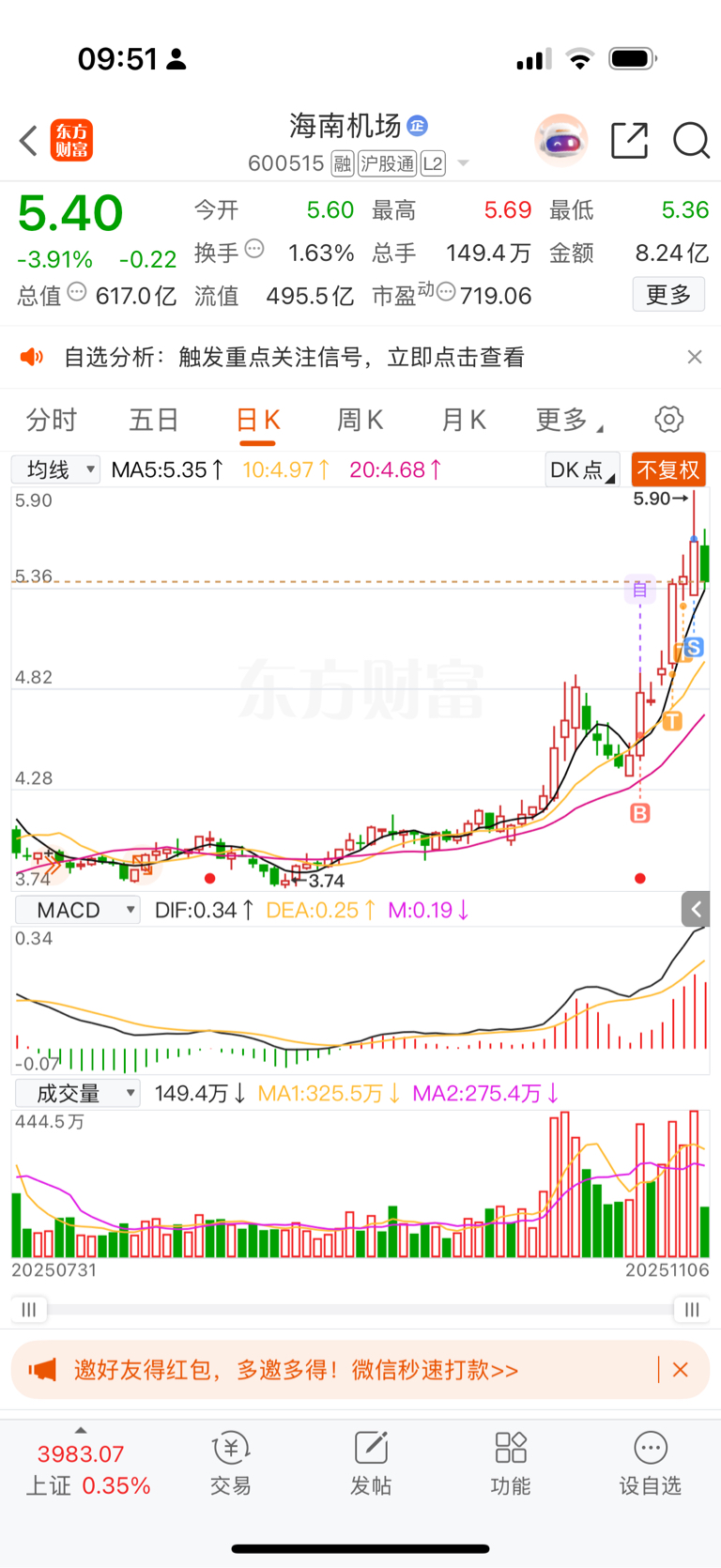 $海南机场(SH600515)$ 跌吧,下来再买
