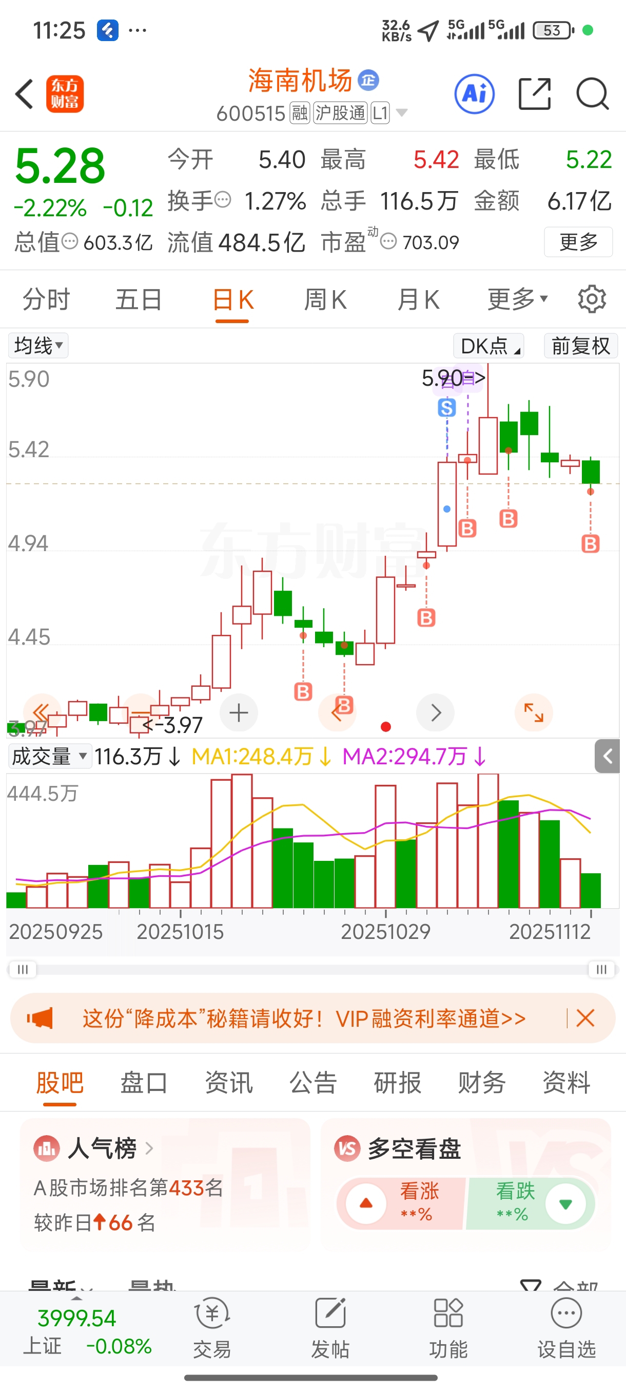 $海南机场(SH600515)$ 浮盈加仓,成本越来越高。