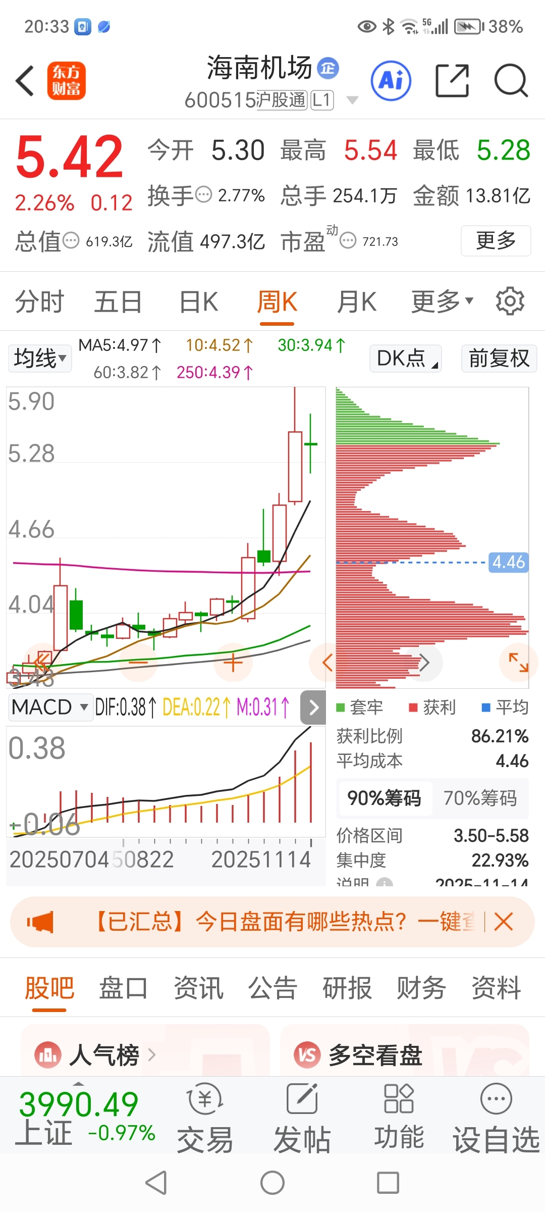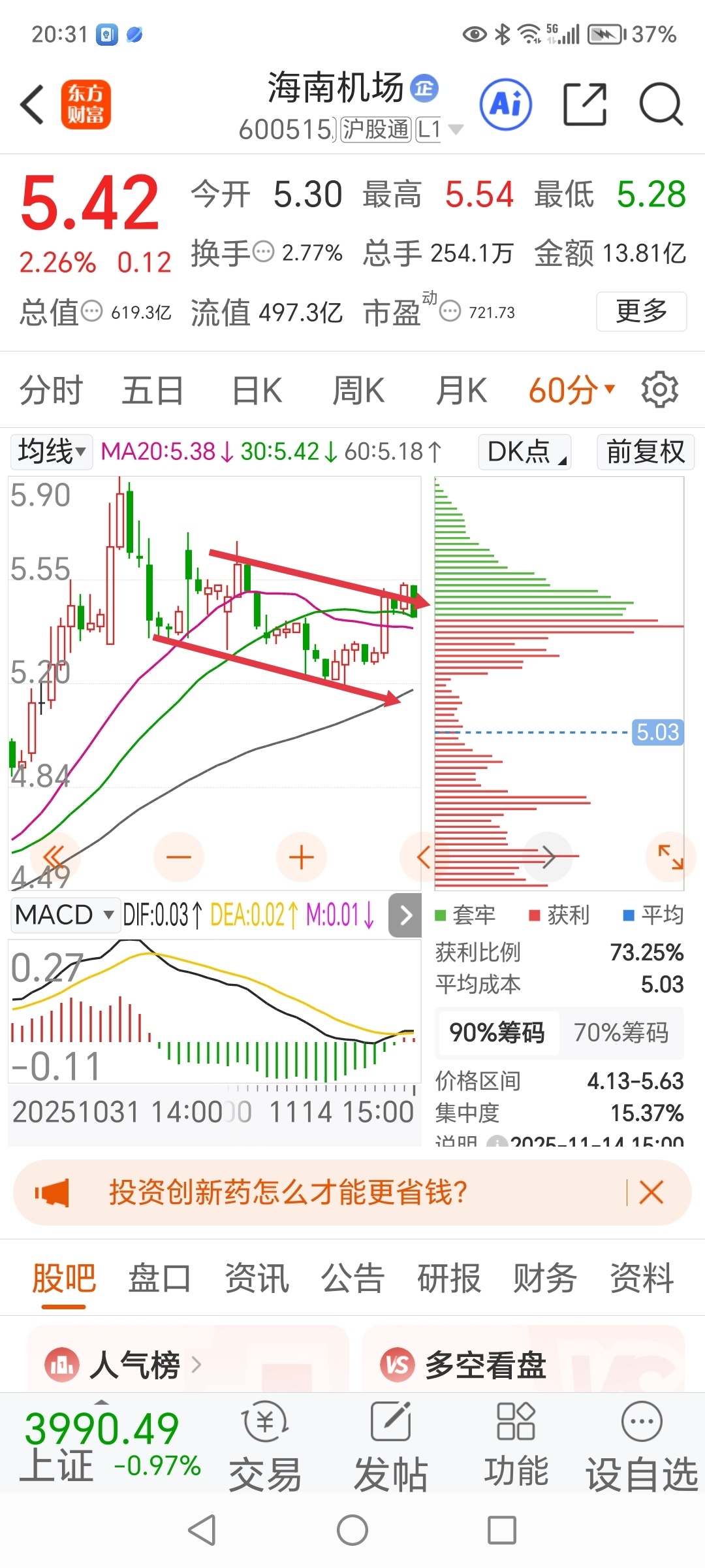 $海南机场(SH600515)$ 上图,分时图看股价旗型整理下周下探后有望向上突破。下图,周线上升途中出现十字星调整后往往继续周阳线。