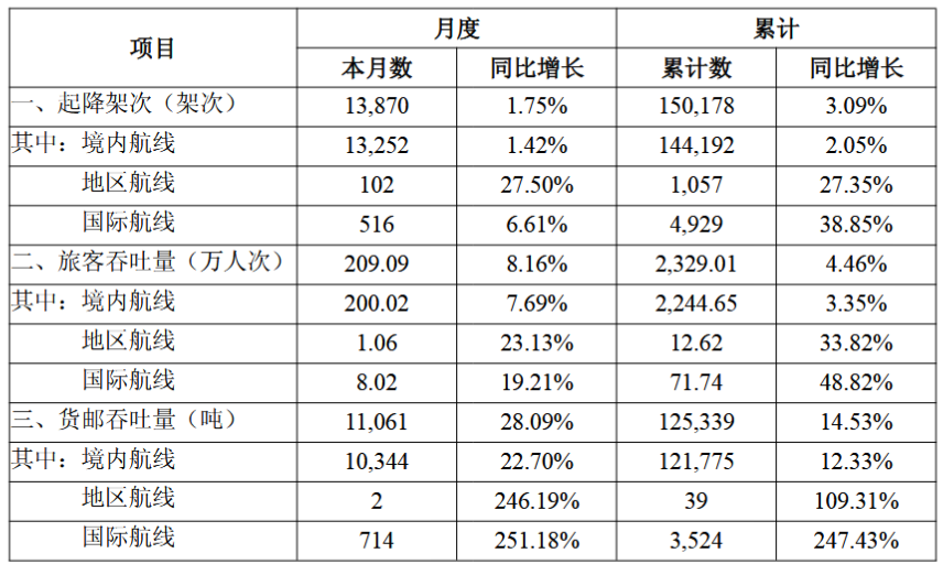 海南机场11月运营数据:起降架次、客货吞吐量均同比增长