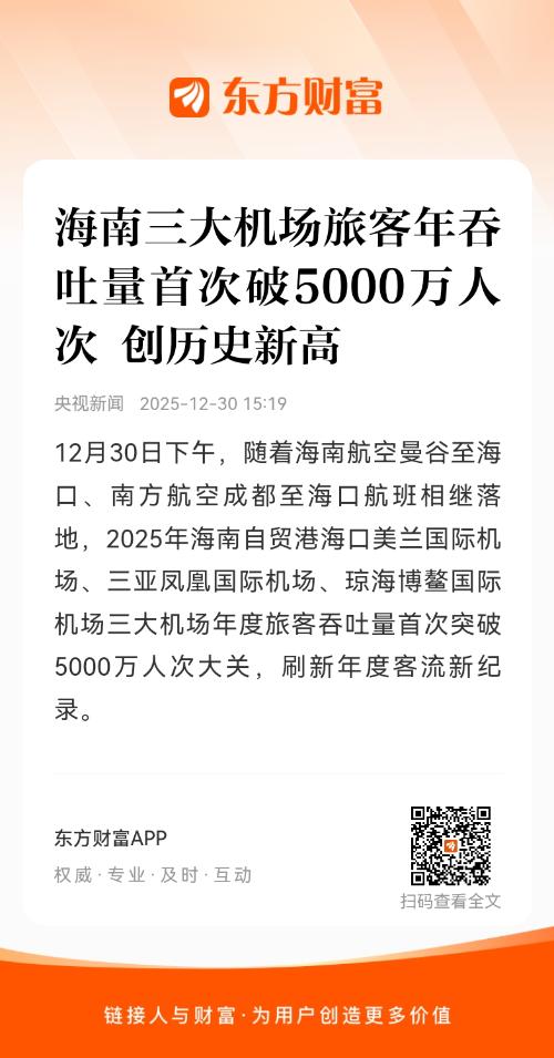 12月30日下午,随着海南航空曼谷至海口、南方航空成都至海口航班相继落地,2025年海南自贸港海口美兰国际机场、三亚凤凰国际机场、琼海博鳌国际机场三大机场年度旅客吞吐量首次突破5000万人次大关,刷新年度客流新纪录。