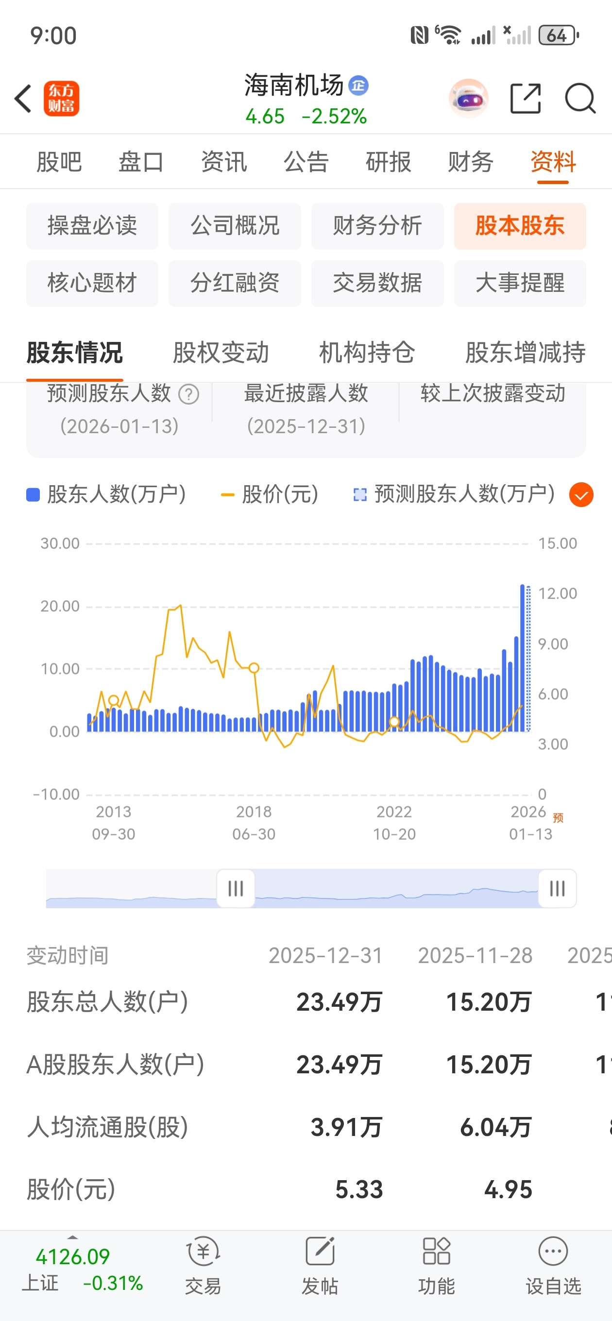 $海南机场(SH600515)$ 给你们看一张图,懂得自然懂,机场要涨,股东人数必须低于10万