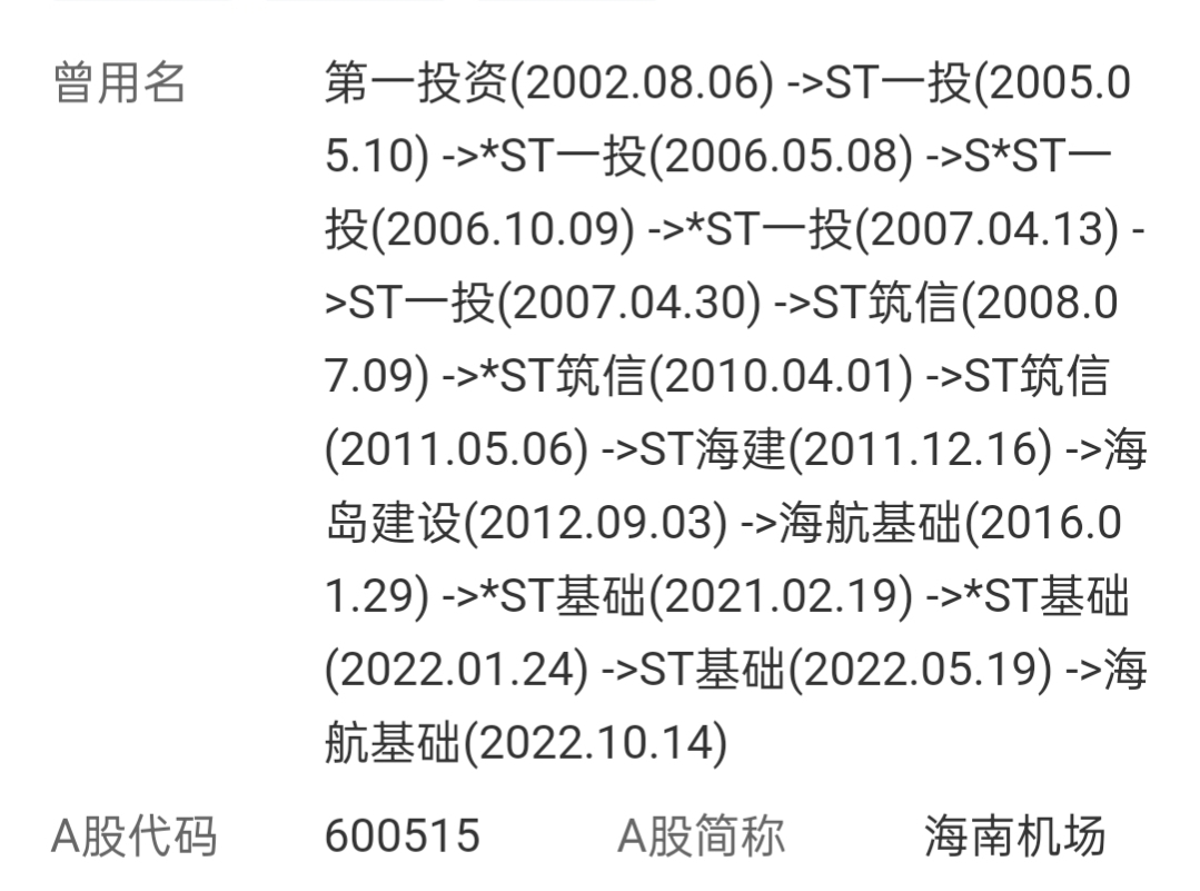 $海南机场(SH600515)$ 海南机场曾经使用过的所有名字,全部都被ST过。