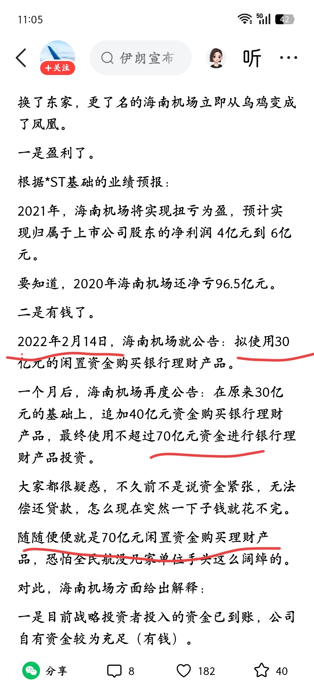 $海南机场(SH600515)$ 请问公司2021年海发控出资85.47亿元收购海南机场,之后公司使用这笔钱的70亿进行理财,这笔资金现在理财收益如何?为什么一直没有提及过这笔资金后续使用详情?如果有这笔钱的收益,利润轻松破20亿