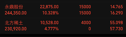 北方稀土:制定的计划是集合竞价4个点以内上,集合竞价挂了个54的单子,开盘价54.5没有成交,开盘后有一波冲高,但冲高遇阻回落又打到了54附近,果断撤单上了,11月1日谈判之前稀土反制概念大概率还会反复活跃,有搞头。